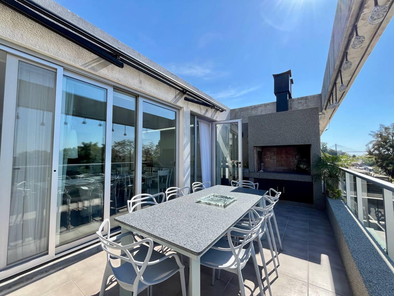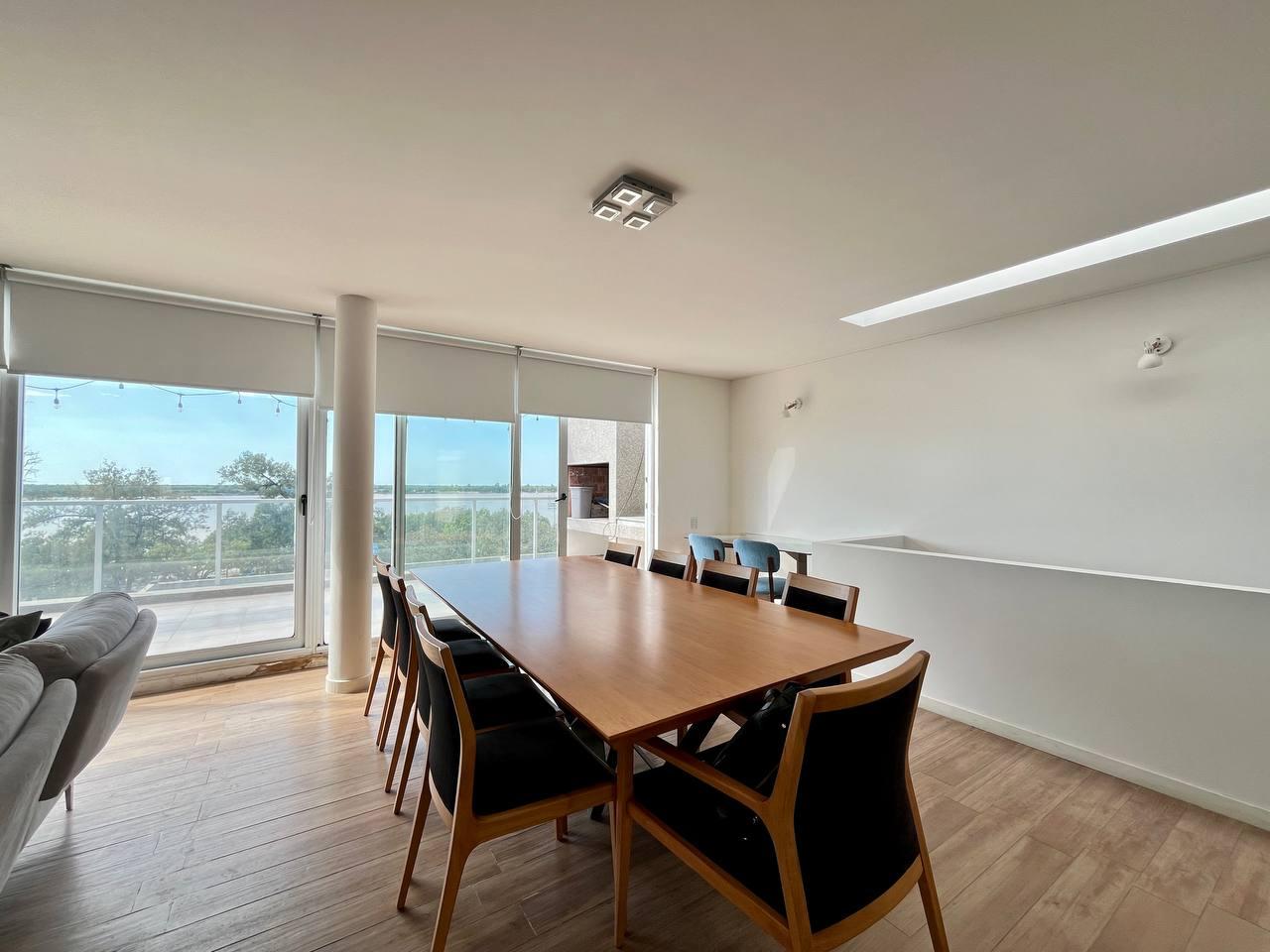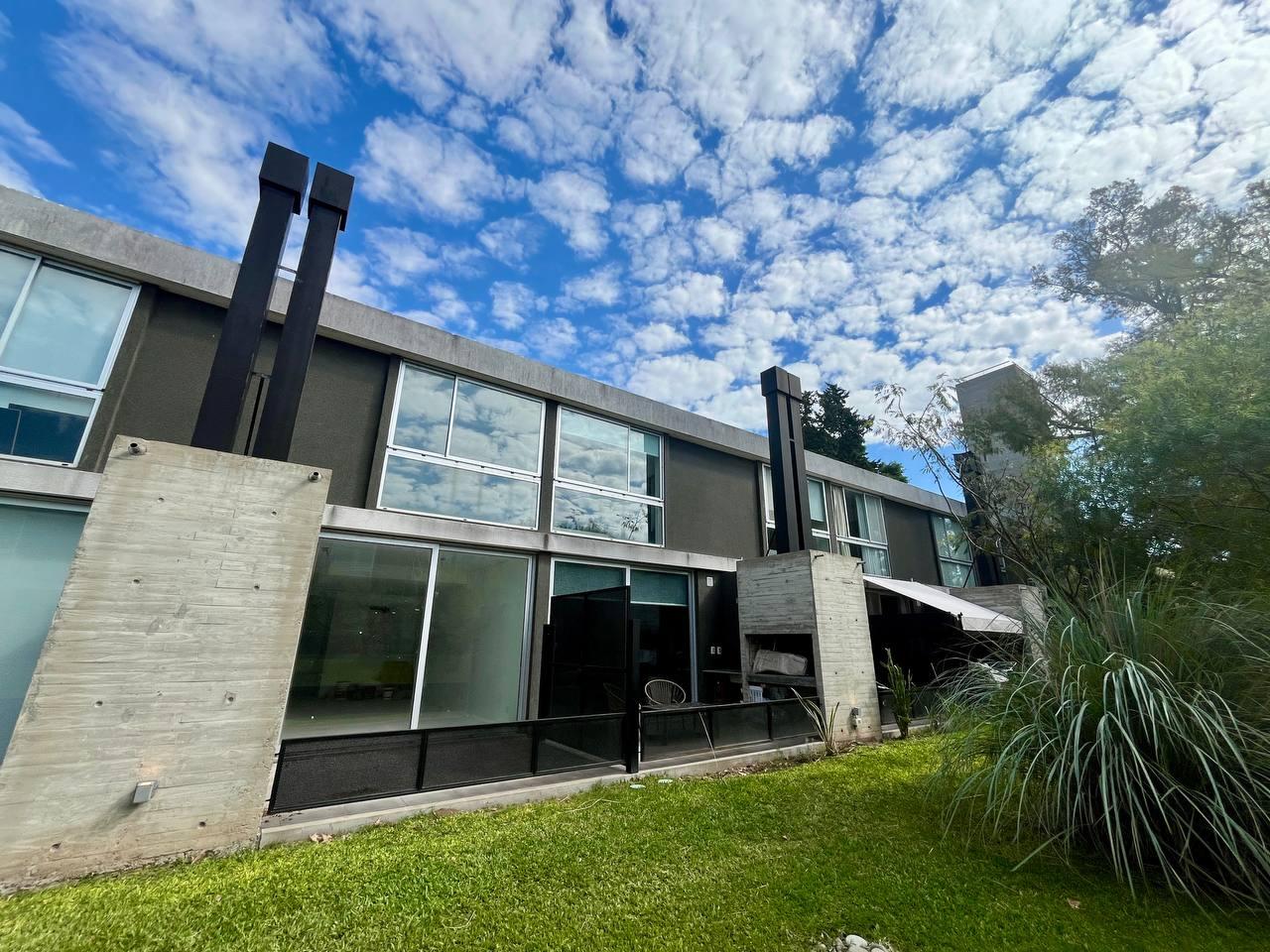 Descripción: Casa tipo dúplex en un predio de jardín parquizado. Cocina y living comedor en planta baja y dormitorios en planta alta. Cocina integrada, toilette de recepción, un baño completo, y la habitación principal en suite con el segundo baño. Posee un vestidor y ambos dormitorios cuentan con placares empotrados y puertas corredizas. Además ambas plantas disponen de terraza exclusiva y parrillero. Calefaccionado con radiadores y/o aires split. Ambientes muy luminosos. Con vista franca o parcial al rio. La unidad tiene dos cocheras.