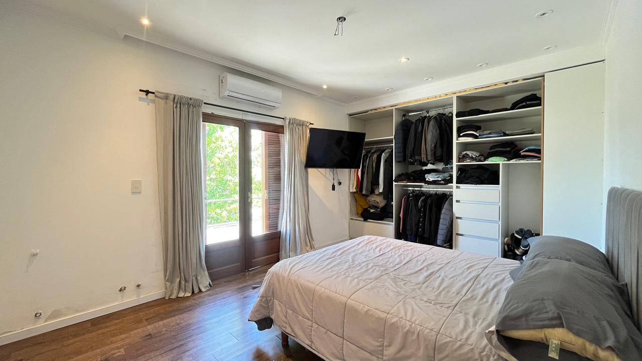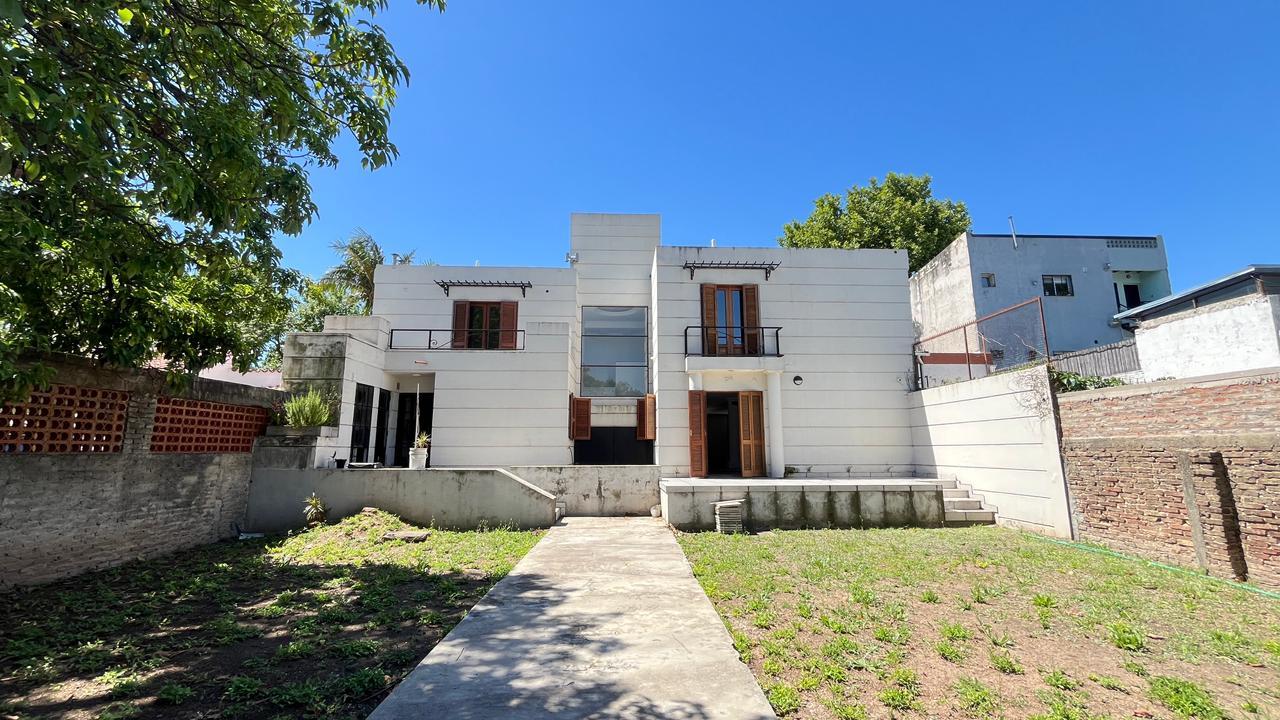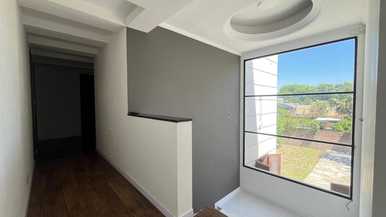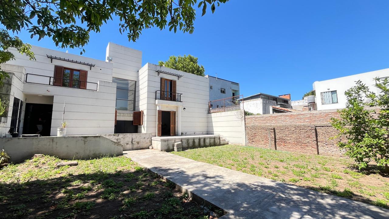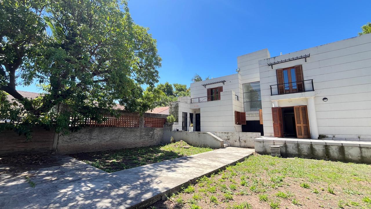 Descripción: Casa desarrollada en dos plantas. Planta baja con hall de recepción, living principal con ventanal al jardín, cocina con lavadero separado y con salida al jardín, baño completo, dormitorio/escritorio, y cochera lateral en el subsuelo. Planta alta cinco dormitorios amplios: mastersuite con vestidor y baño en suite (falta terminar), cuatro dormitorios secundarios con placares empotrados, más un baño completo con ventilación natural. Exterior con jardín.