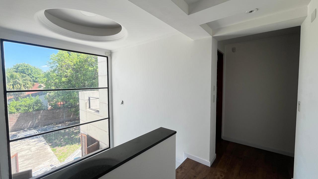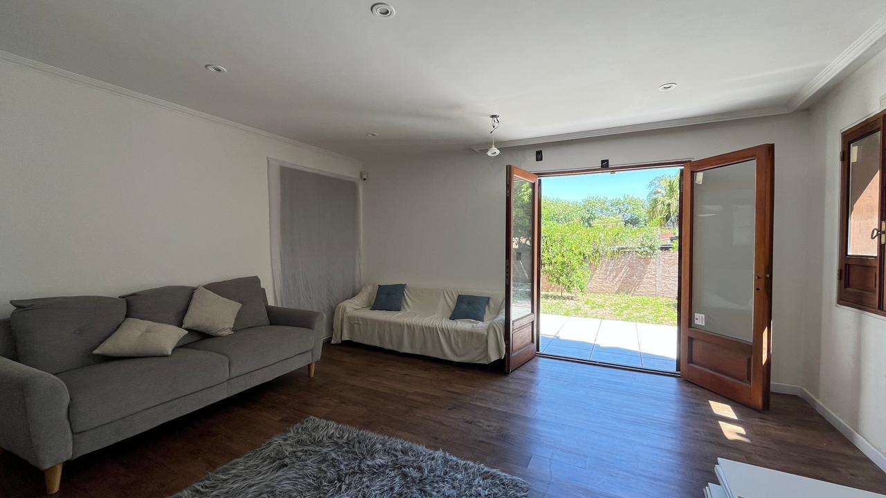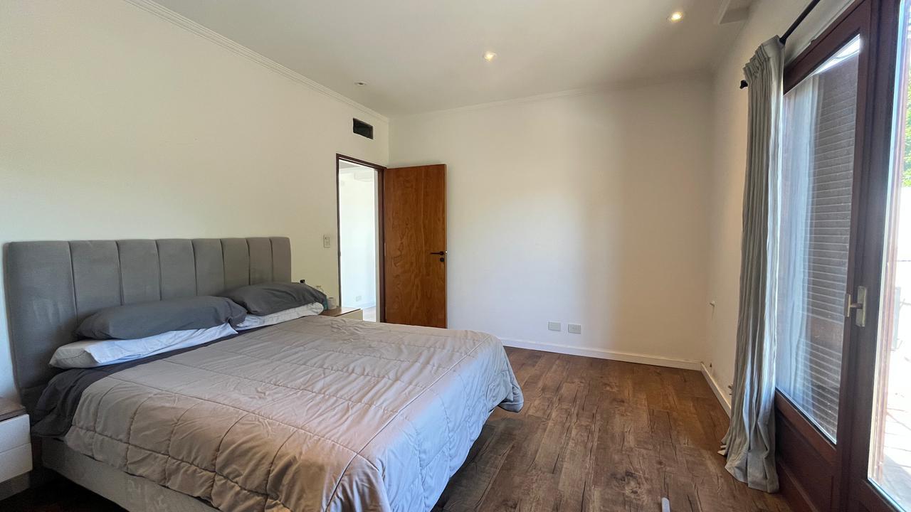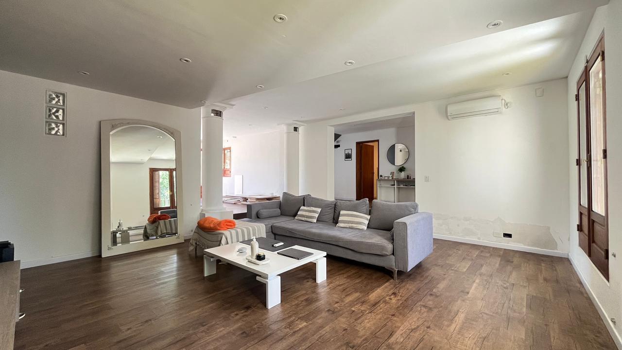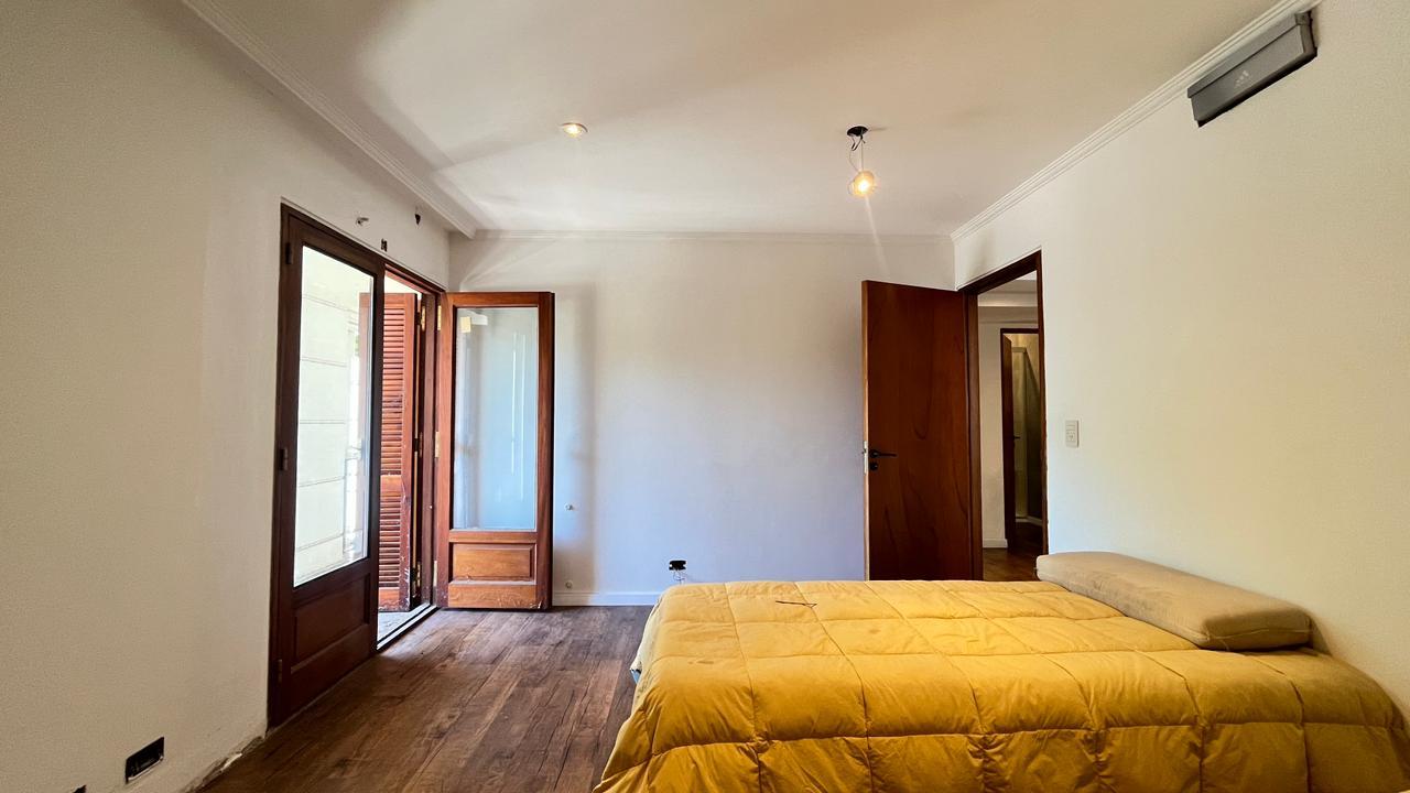 Descripción: Casa desarrollada en dos plantas. Planta baja con hall de recepción, living principal con ventanal al jardín, cocina con lavadero separado y con salida al jardín, baño completo, dormitorio/escritorio, y cochera lateral en el subsuelo. Planta alta cinco dormitorios amplios: mastersuite con vestidor y baño en suite (falta terminar), cuatro dormitorios secundarios con placares empotrados, más un baño completo con ventilación natural. Exterior con jardín.