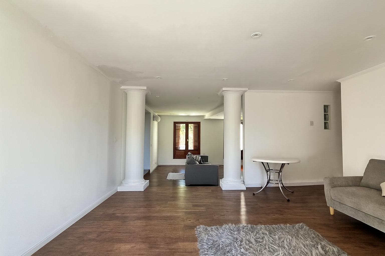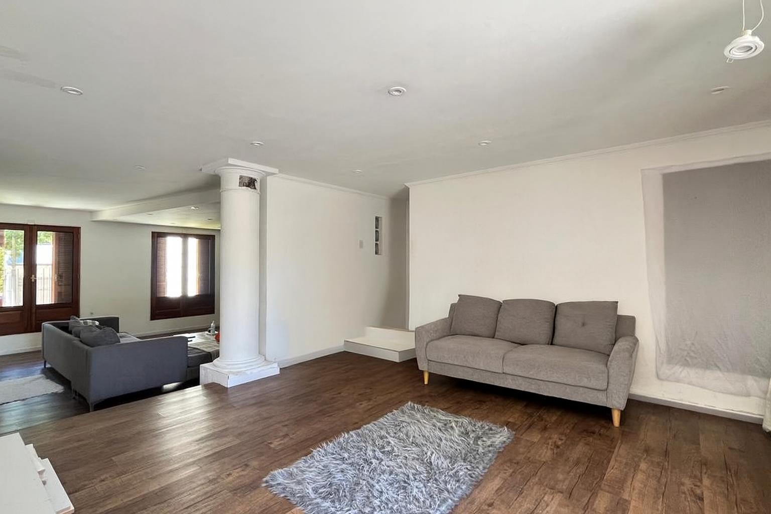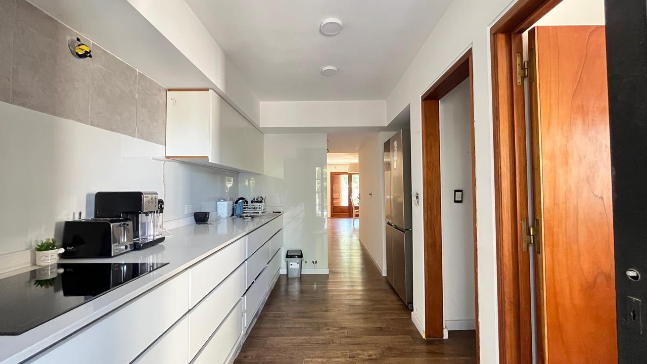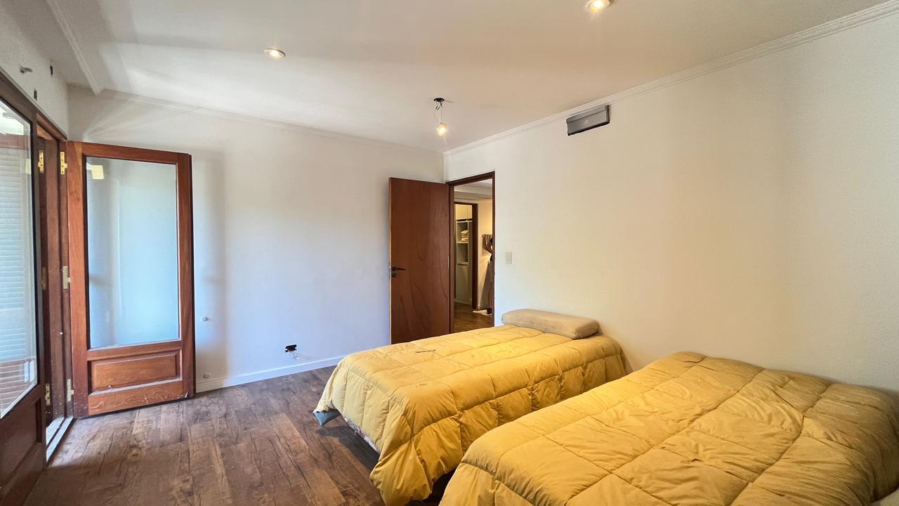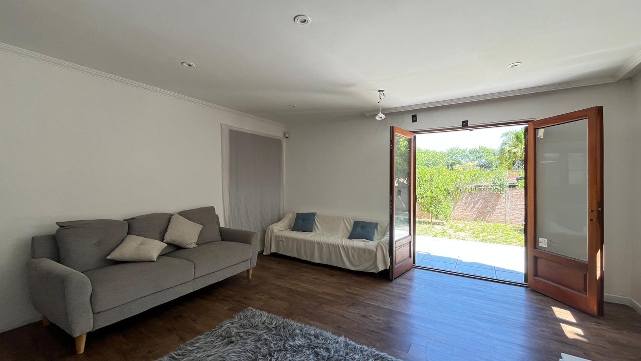 Descripción: Casa desarrollada en dos plantas. Planta baja con hall de recepción, living principal con ventanal al jardín, cocina con lavadero separado y con salida al jardín, baño completo, dormitorio/escritorio, y cochera lateral en el subsuelo. Planta alta cinco dormitorios amplios: mastersuite con vestidor y baño en suite (falta terminar), cuatro dormitorios secundarios con placares empotrados, más un baño completo con ventilación natural. Exterior con jardín.