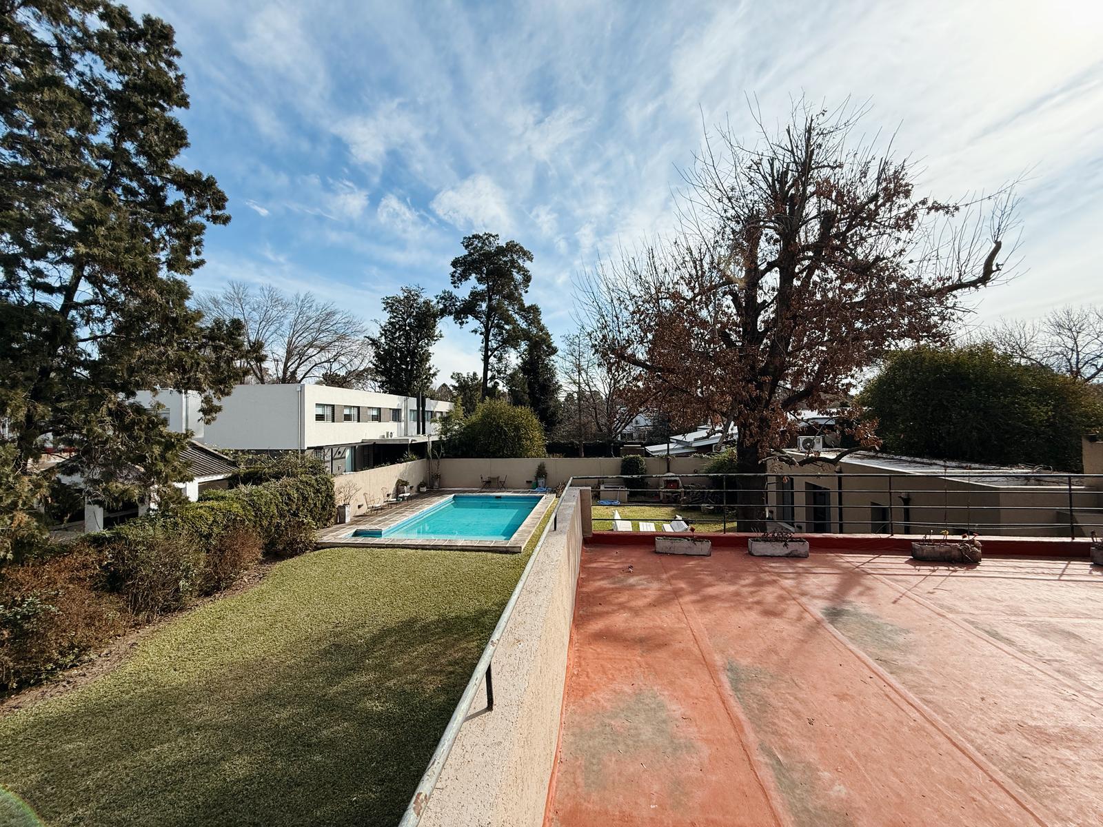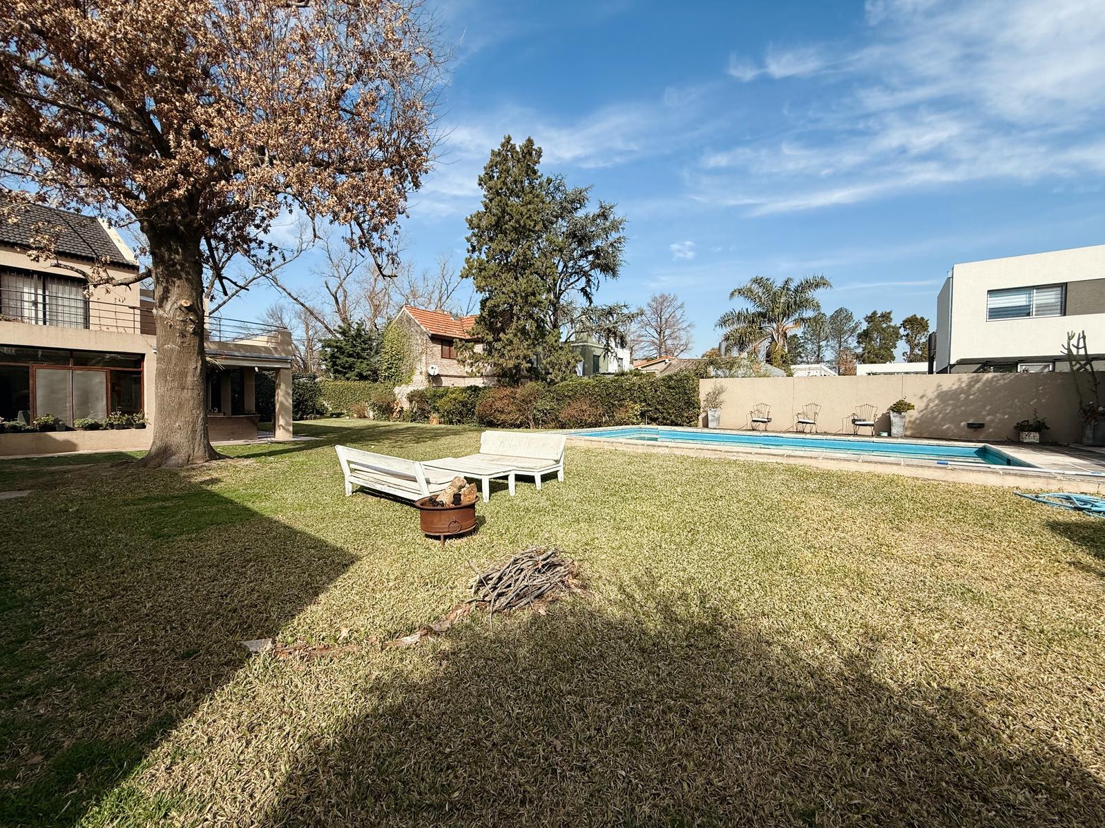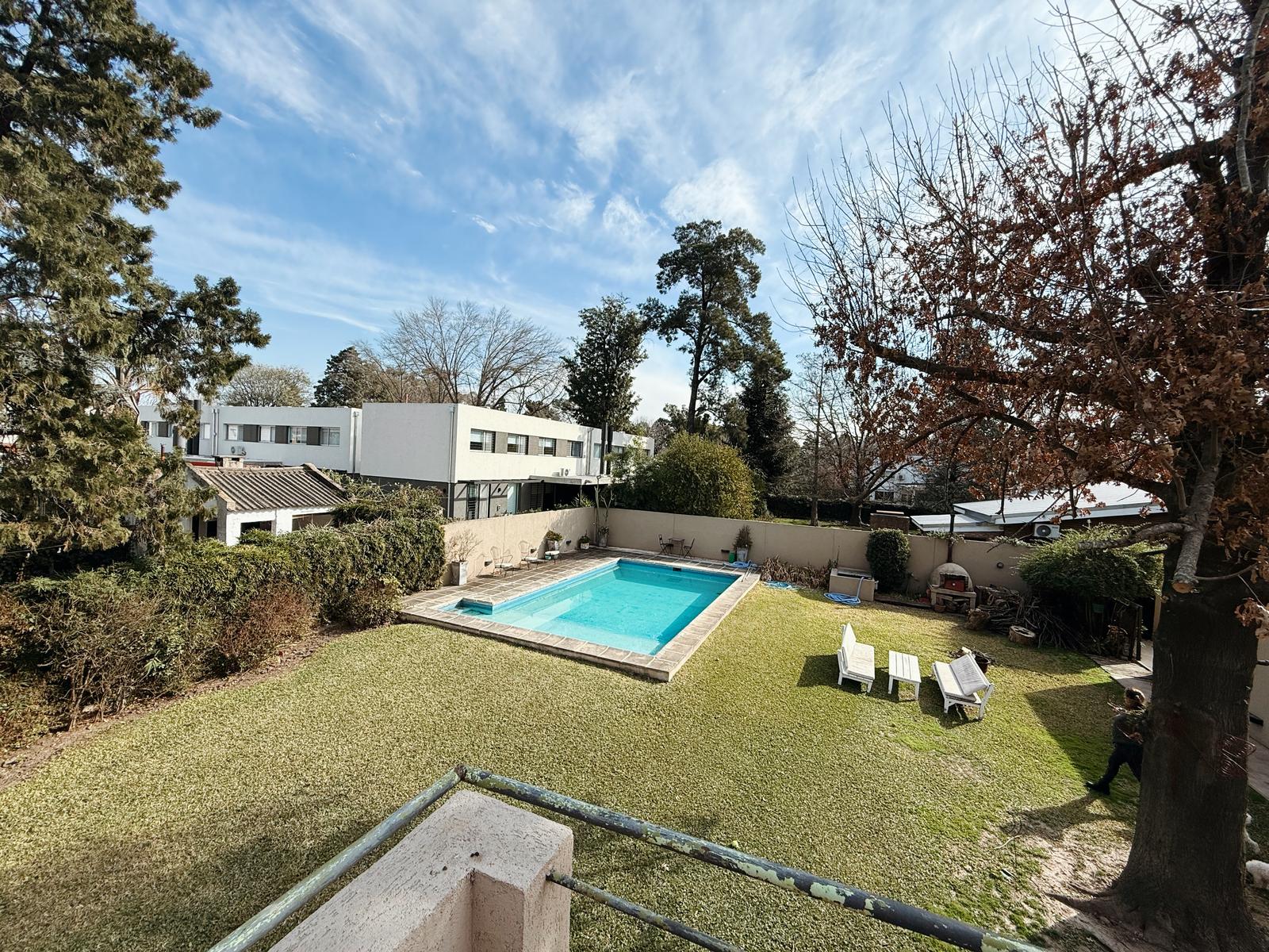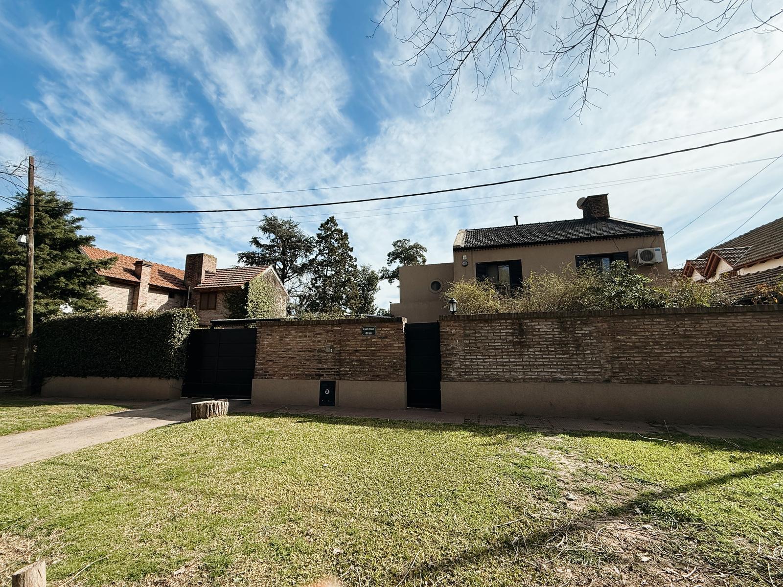 Descripción: Se accede por un doble ingreso, tanto vehicular como peatonal, que conduce a un amplio hall de recepción. Desde allí se integra un luminoso living-comedor con grandes ventanales hacia el jardín, un toilette de cortesía y un escritorio o dormitorio con conexión directa a la cocina. La cocina se encuentra totalmente equipada con alacenas, bajo mesada, mesada de granito, horno y campana, y se complementa con un comedor diario. En esta planta también se ubican un lavadero independiente, un quincho cerrado con baño completo y una galería cubierta de generosas dimensiones que conecta con el parque. El sector exterior dispone de parrillero, cuarto de guardado, sala de máquinas, un extenso jardín parquizado y piscina con solárium.