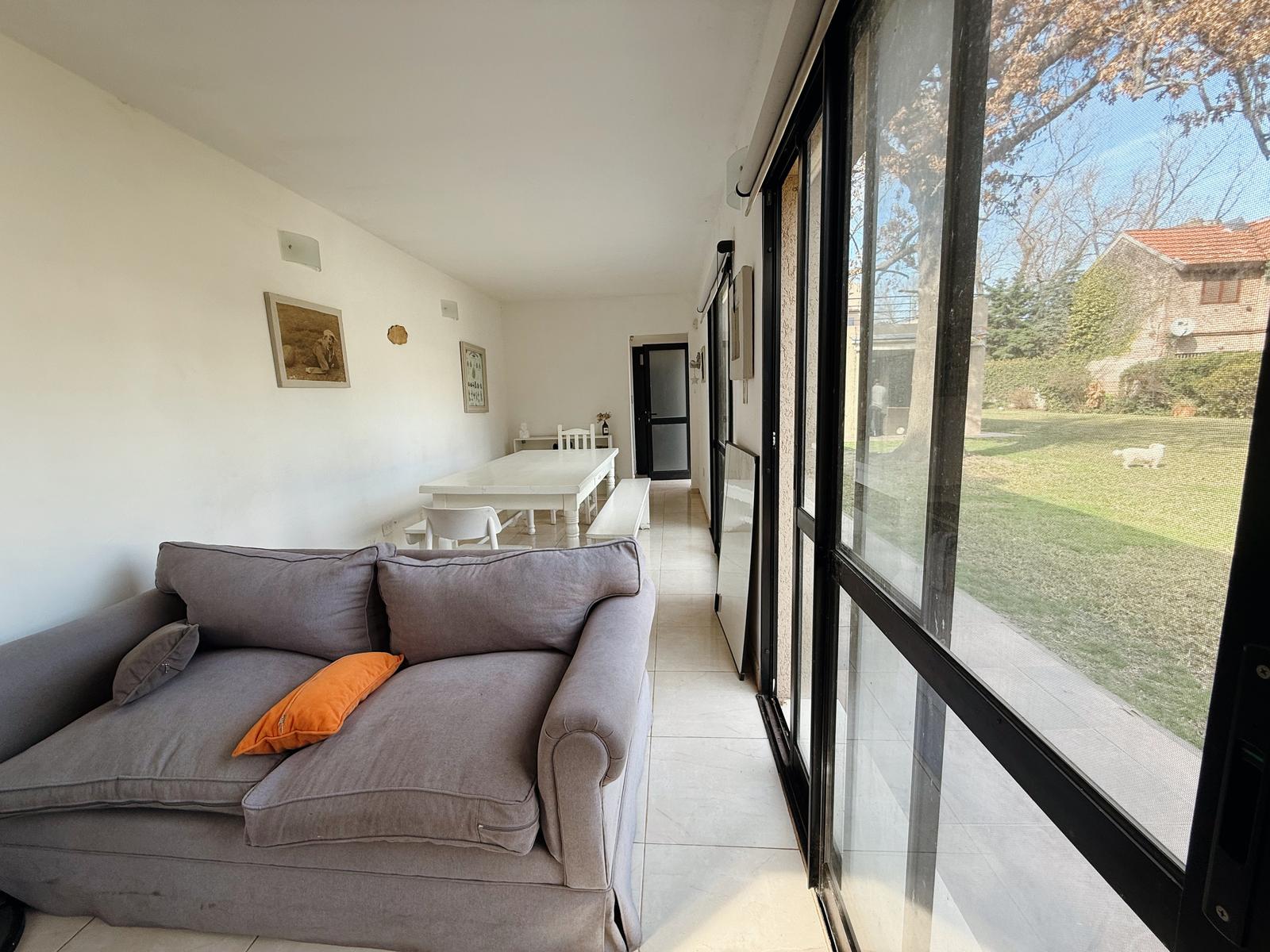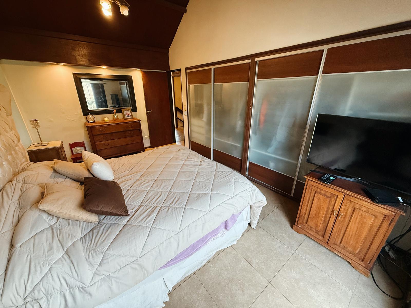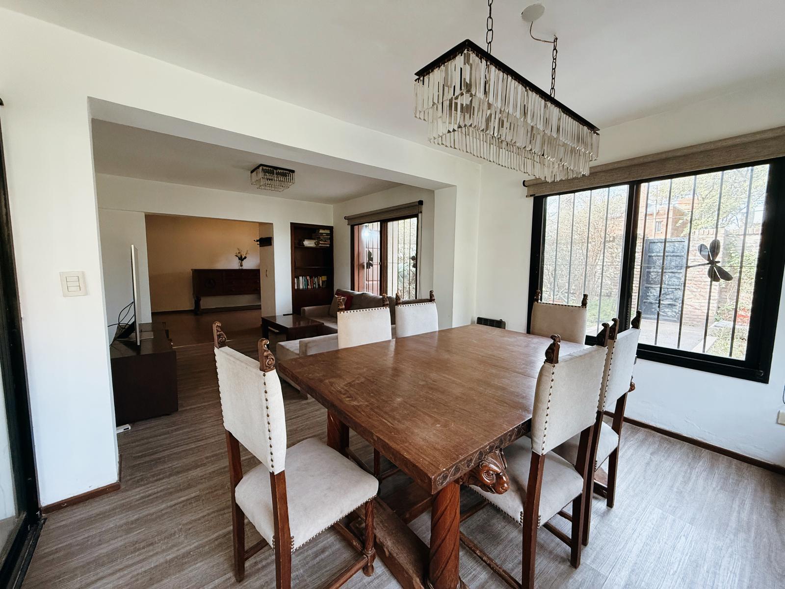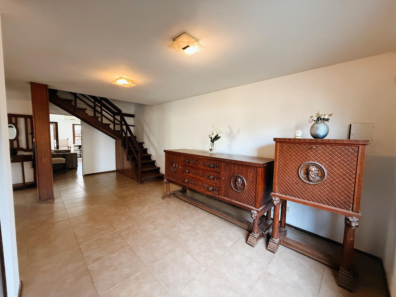 Descripción: Se accede por un doble ingreso, tanto vehicular como peatonal, que conduce a un amplio hall de recepción. Desde allí se integra un luminoso living-comedor con grandes ventanales hacia el jardín, un toilette de cortesía y un escritorio o dormitorio con conexión directa a la cocina. La cocina se encuentra totalmente equipada con alacenas, bajo mesada, mesada de granito, horno y campana, y se complementa con un comedor diario. En esta planta también se ubican un lavadero independiente, un quincho cerrado con baño completo y una galería cubierta de generosas dimensiones que conecta con el parque. El sector exterior dispone de parrillero, cuarto de guardado, sala de máquinas, un extenso jardín parquizado y piscina con solárium.