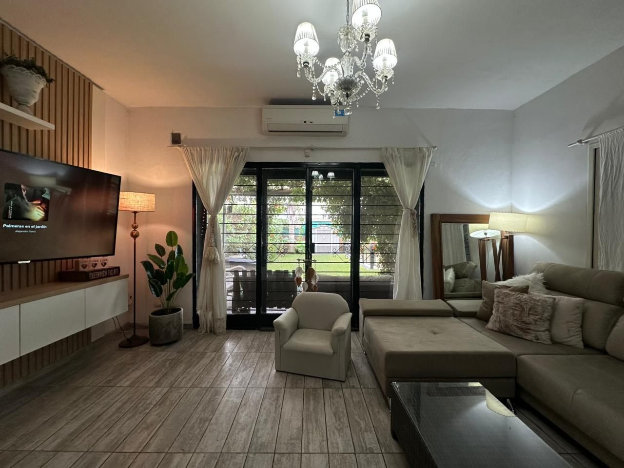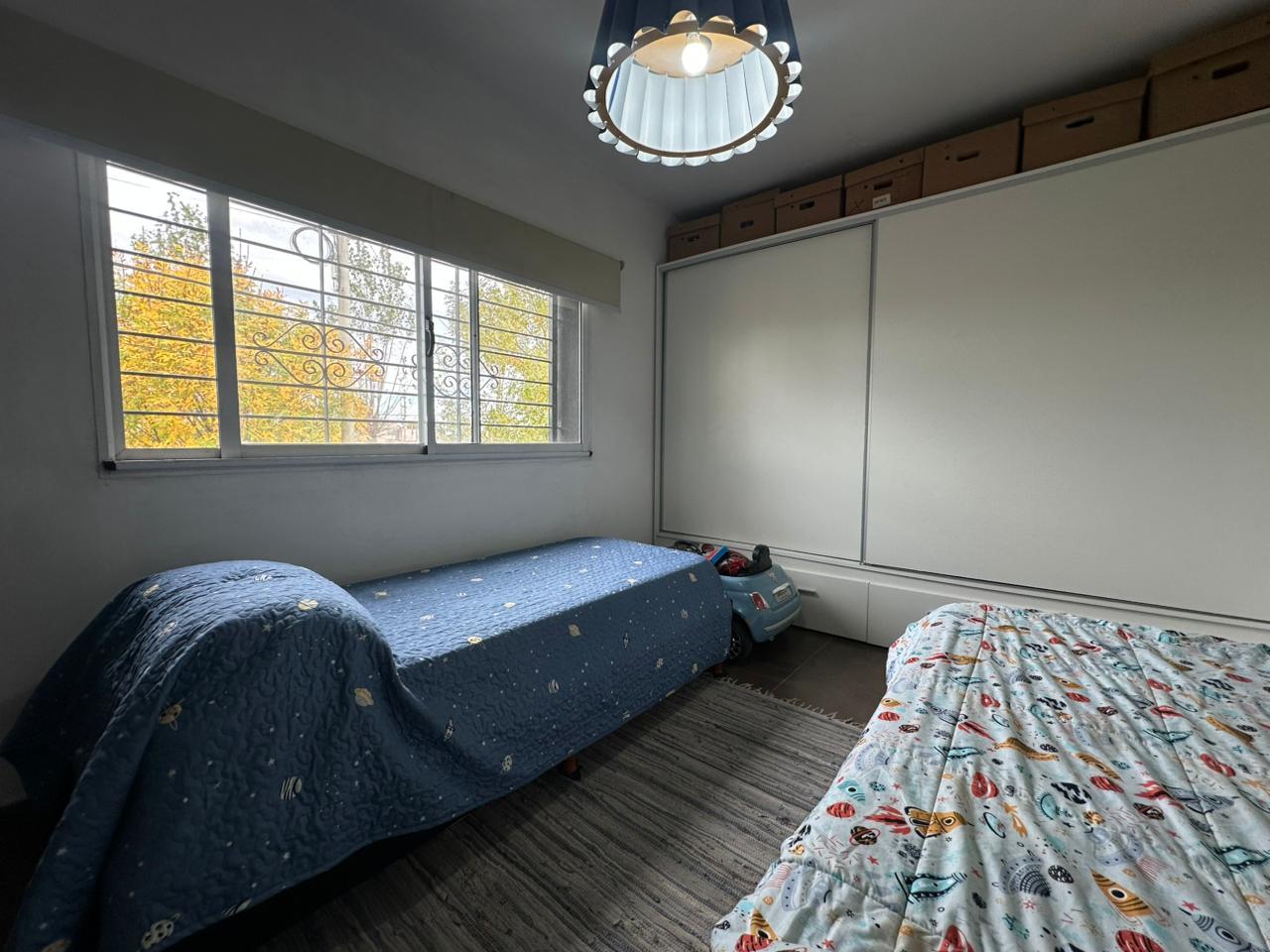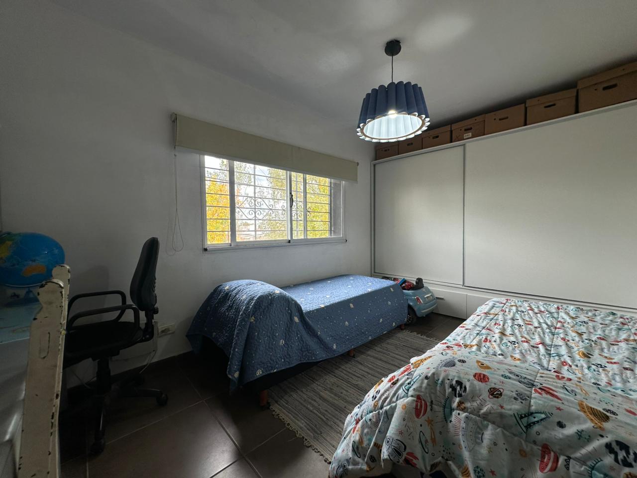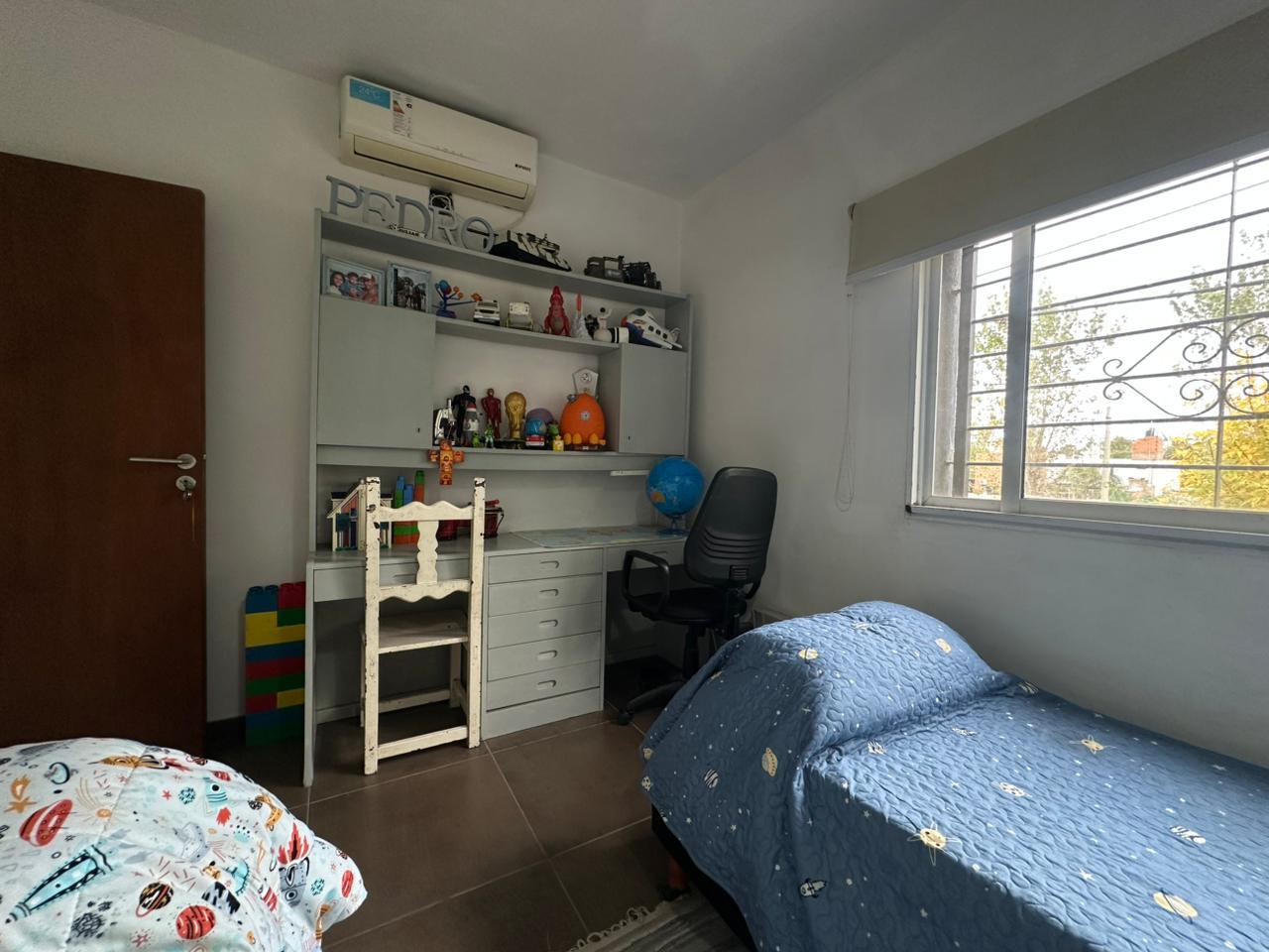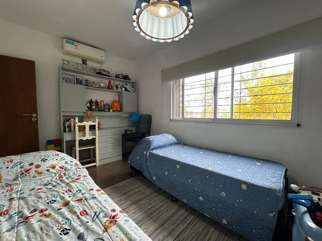 Una escalera conduce a la planta alta, donde un pasillo distribuidor conecta los dos dormitorios. El primero, con placares completos, ofrece espacio cómodo para cama doble o dos camas individuales y escritorio, con ventana al frente equipada con rejas y mosquiteros. El segundo dormitorio, de mayores dimensiones, se destaca por su gran ventanal con vistas abiertas al jardín y la piscina, brindando excelente luz natural. Ambos cuentan con aire acondicionado frío/calor.
