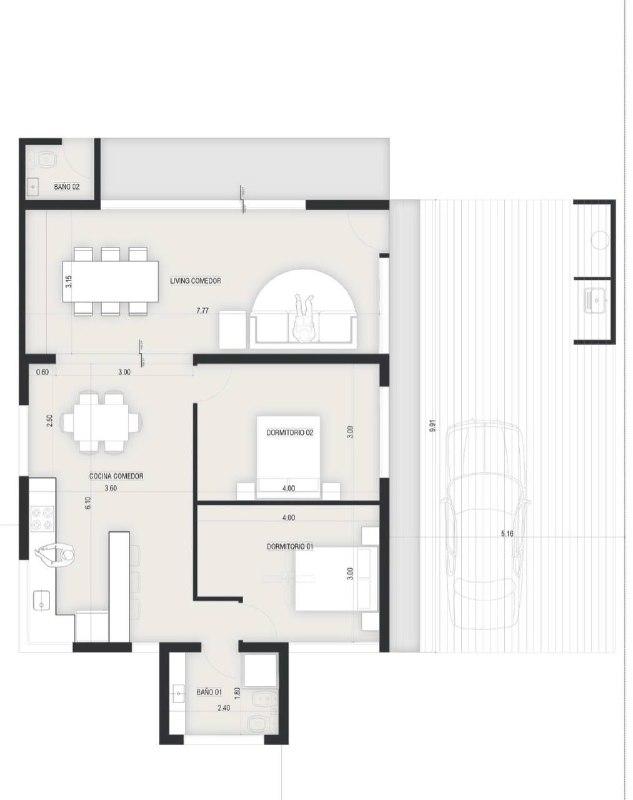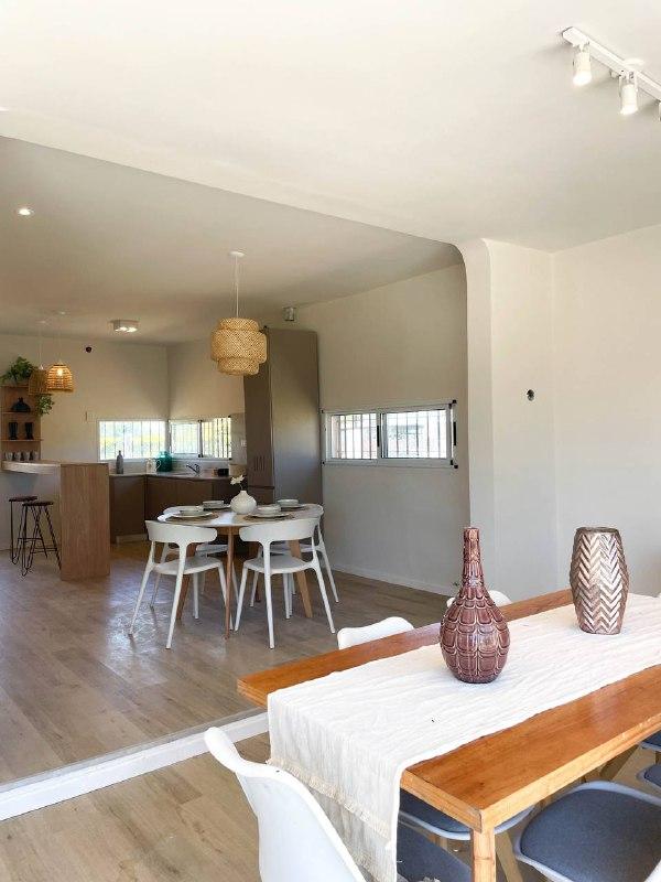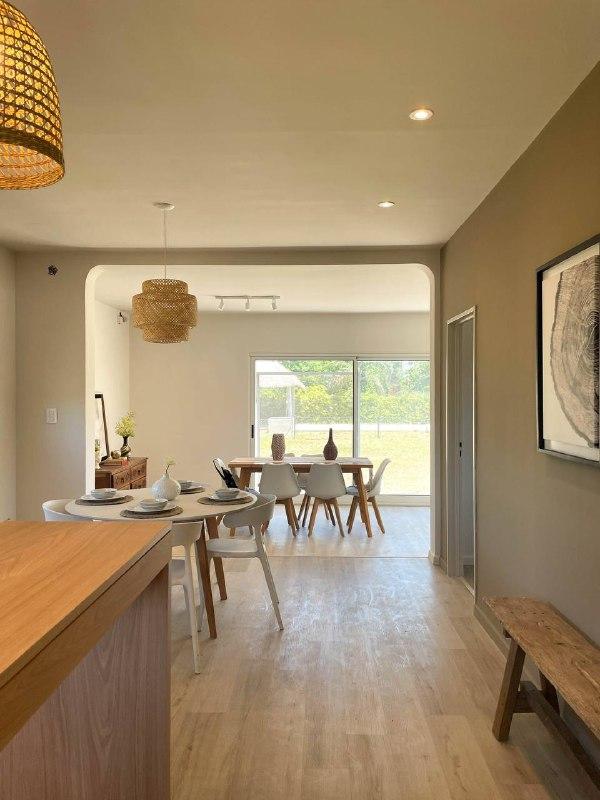 Descripción: La propiedad se desarrolla en planta baja. Ingresamos por el living comedor que se conecta a la cocina con barra desayunadora equipada con alacenas, bajo mesada y comedor diario. Una galería que ofrece un espacio adicional para el entretenimiento con un parrillero. Además, cuenta con dos dormitorios de amplias dimensiones con placares y un baño completo con ducha, complementado por un toilette de recepción para mayor comodidad. El exterior de la casa tiene un amplio jardín que invita a disfrutar del aire libre. La propiedad también cuenta con una pileta de material.