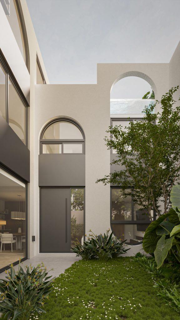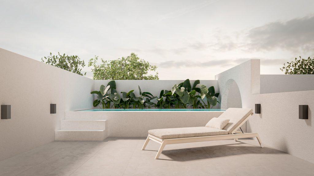 Sobre la planta alta se ubican los tres dormitorios, uno de ellos con vestidor y baño en suite, además cuenta con otro baño de uso común. Sobre la terraza se ubica un quincho con parrillero y barra, un toilette y un espacio de solárium con piscina.