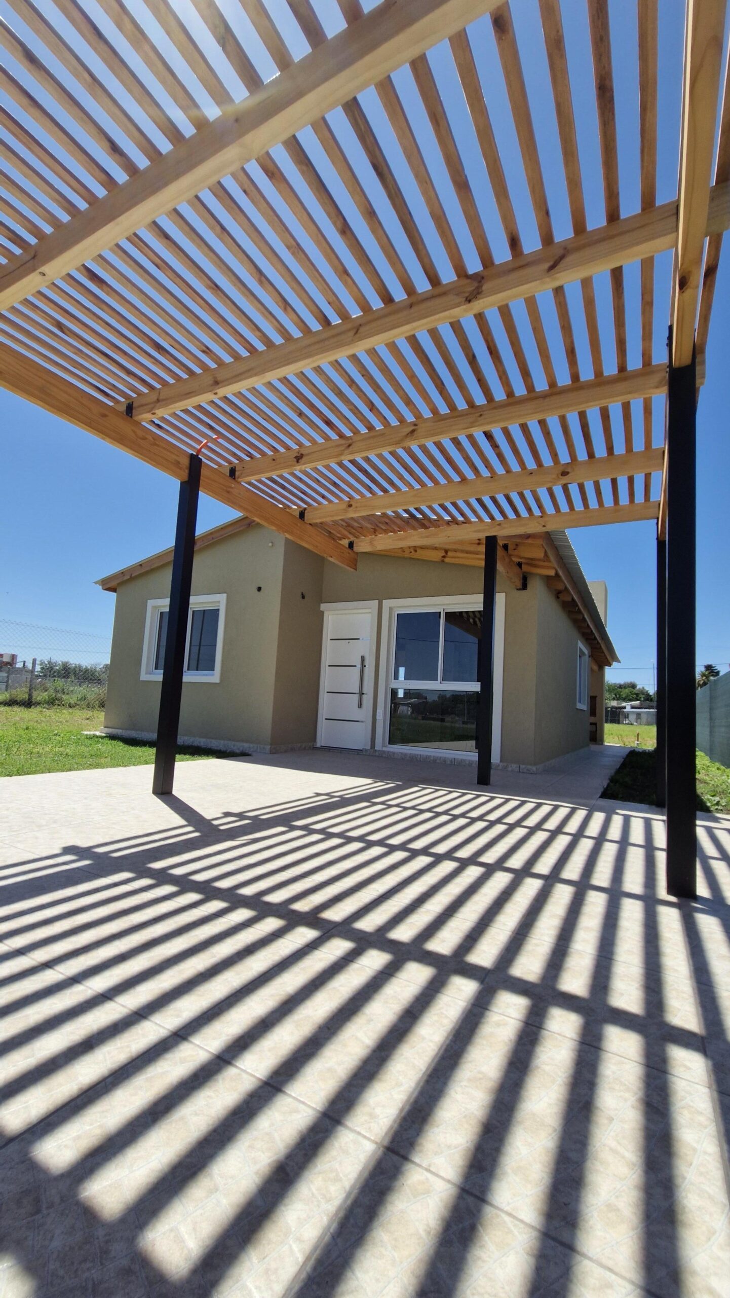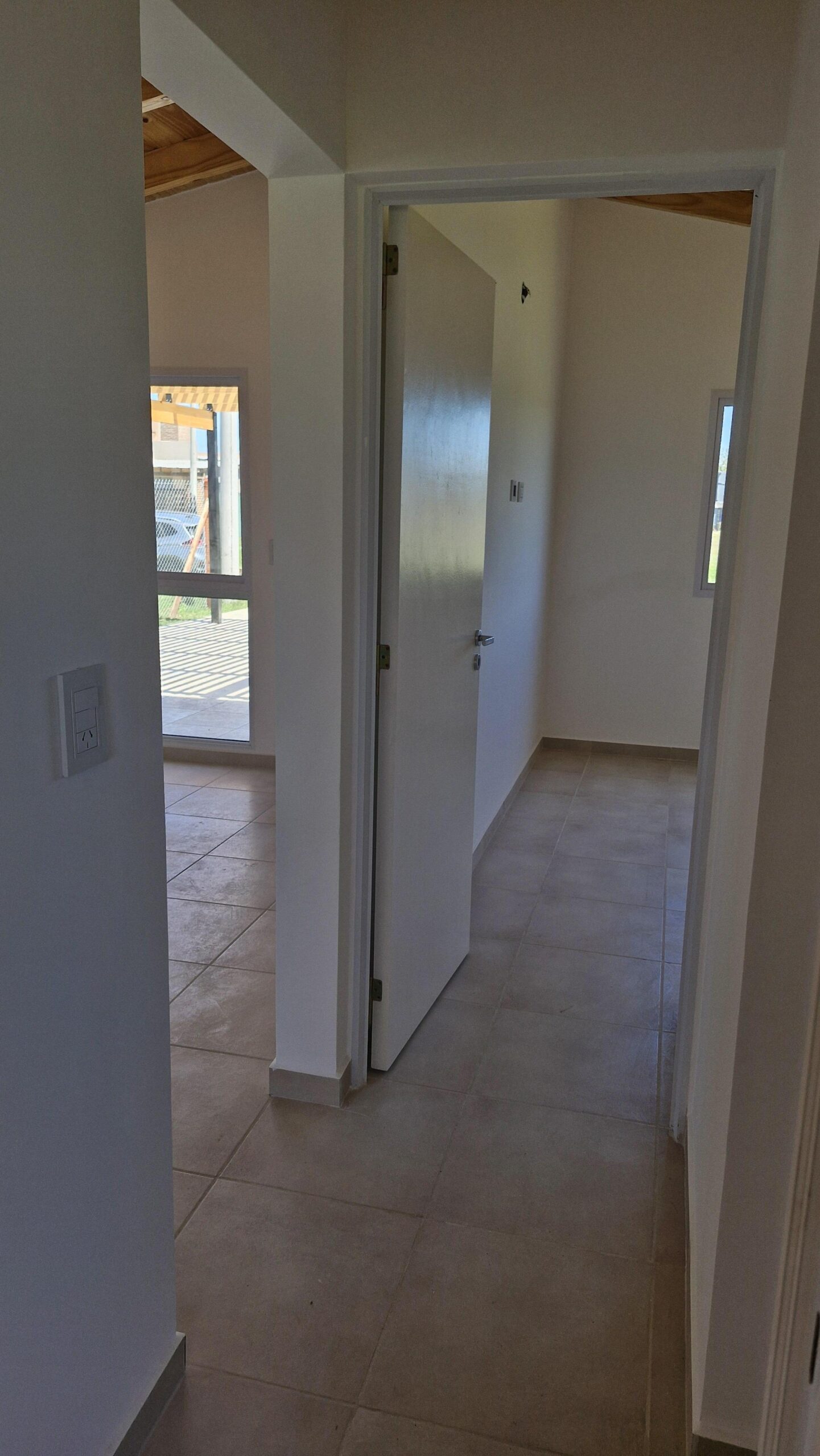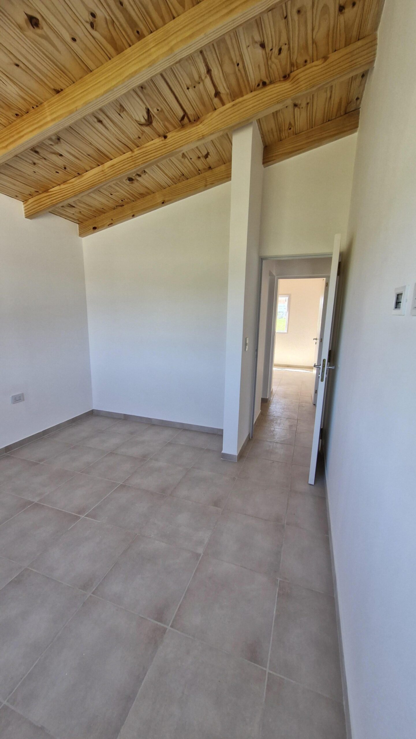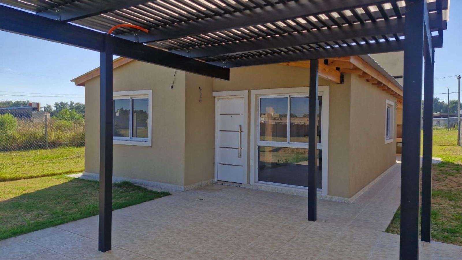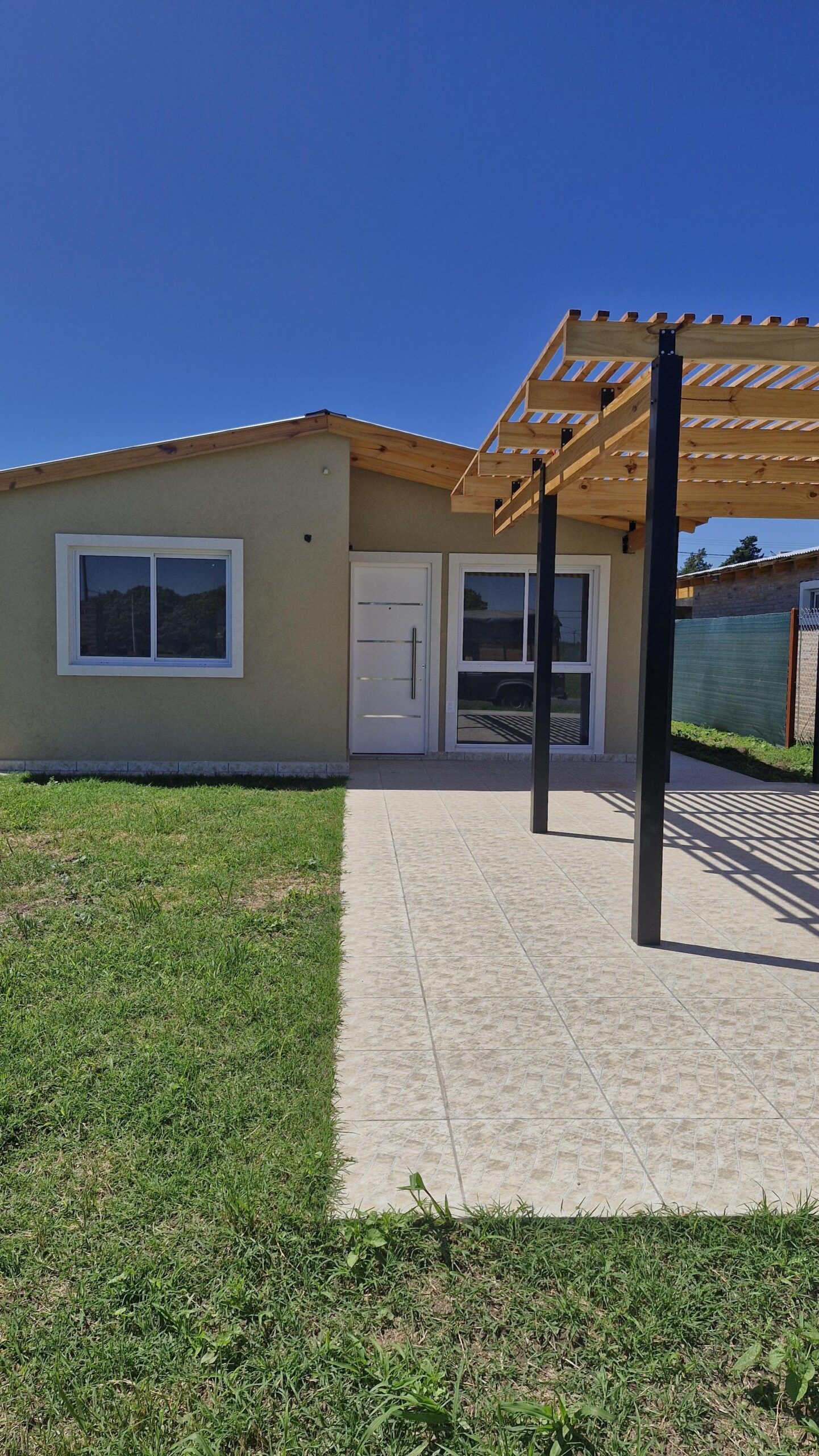 Descripción: Casa estilo chalet a estrenar desarrollada en una planta, con un diseño funcional y luminoso. Cuenta con dos dormitorios con espacio previsto para placares empotrados y un baño completo con receptáculo de ducha y ventilación natural, lo que garantiza buena iluminación y circulación de aire.