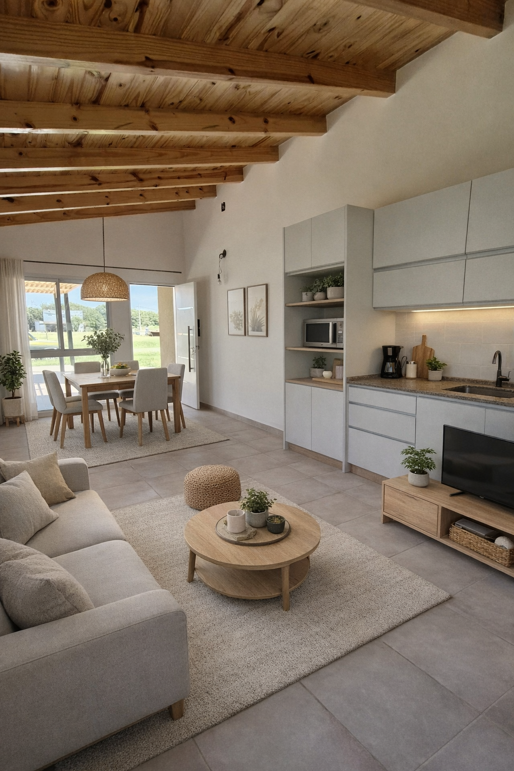 El sector social se compone de un cómodo estar–comedor con cocina integrada, equipada con mobiliario moderno que optimiza el espacio y la funcionalidad.