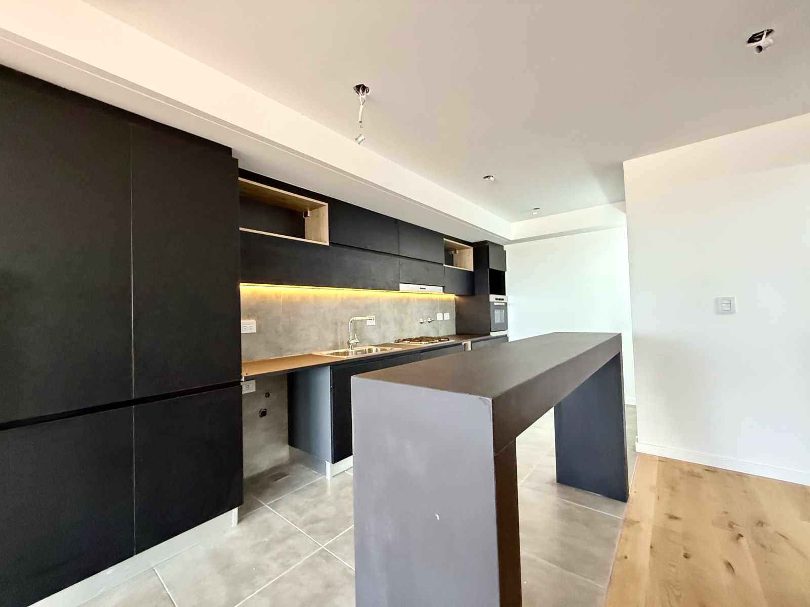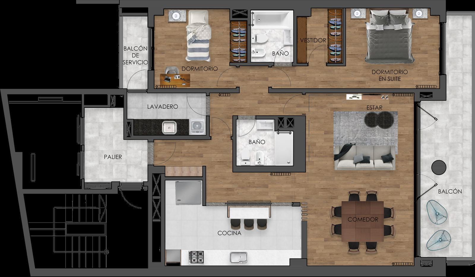 La cocina se presenta semi integrada, separada mediante barra desayunadora, y cuenta con lavadero independiente, aportando funcionalidad al uso diario. La unidad dispone de dos dormitorios: el principal en suite, con sector de vestidor y baño completo; el segundo dormitorio cuenta con placard y se complementa con un segundo baño completo.