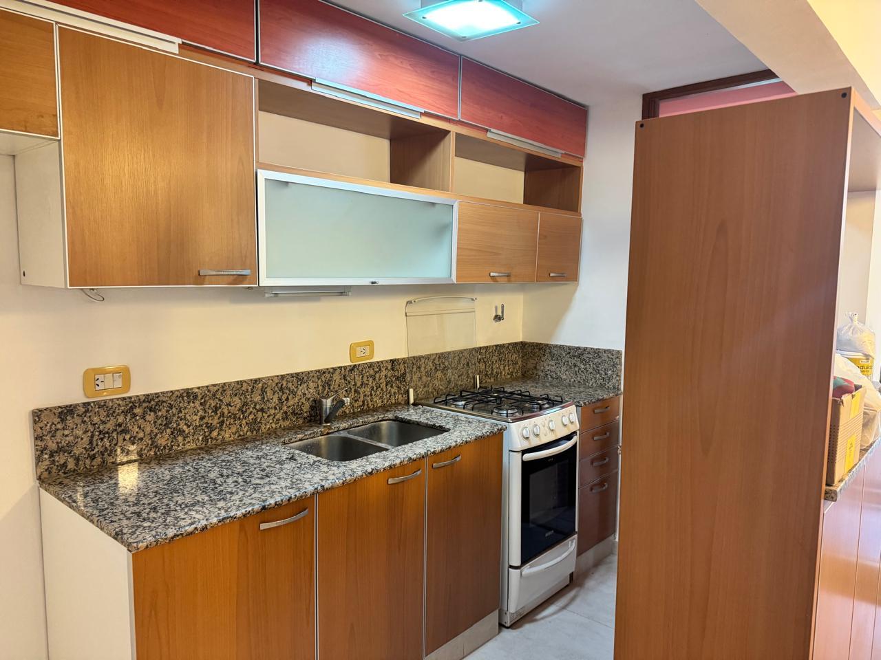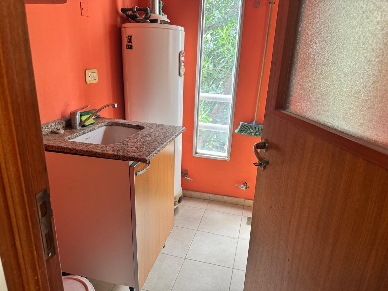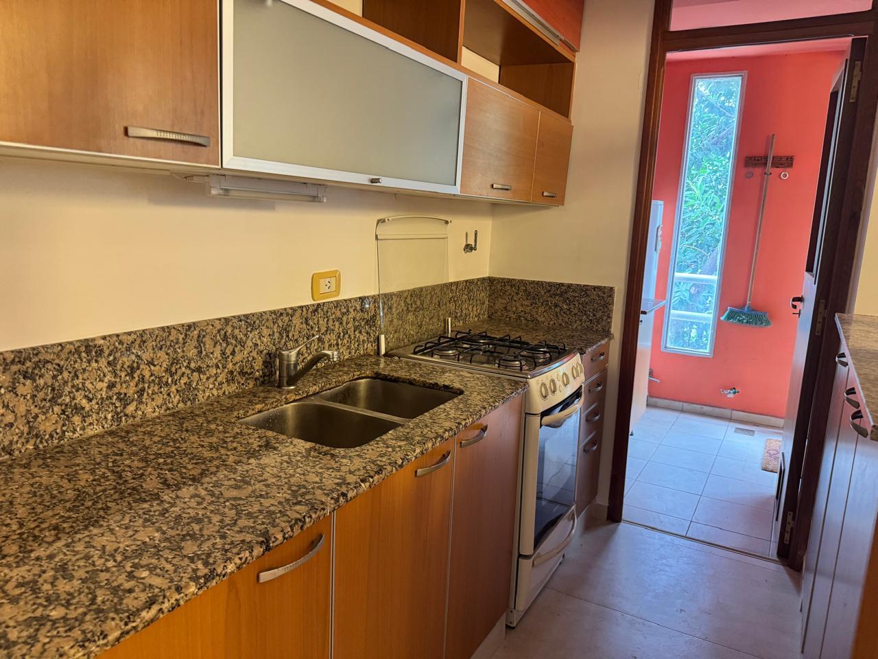 La cocina se integra de manera funcional al ambiente principal y se encuentra totalmente equipada. Se destaca por su barra desayunadora de mármol, abundante espacio de guardado (alacenas y bajo mesada) y cocina a gas de cuatro hornallas. Desde allí se accede al lavadero independiente, que cuenta con conexión para lavarropas, estanterías y termotanque para el suministro de agua caliente.