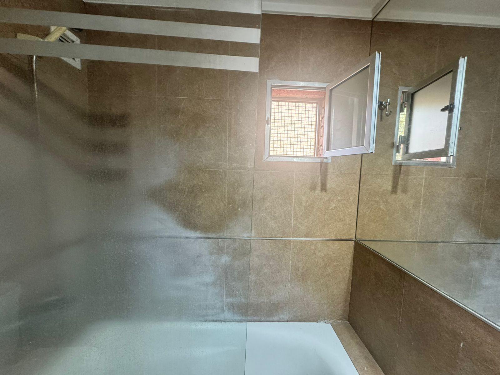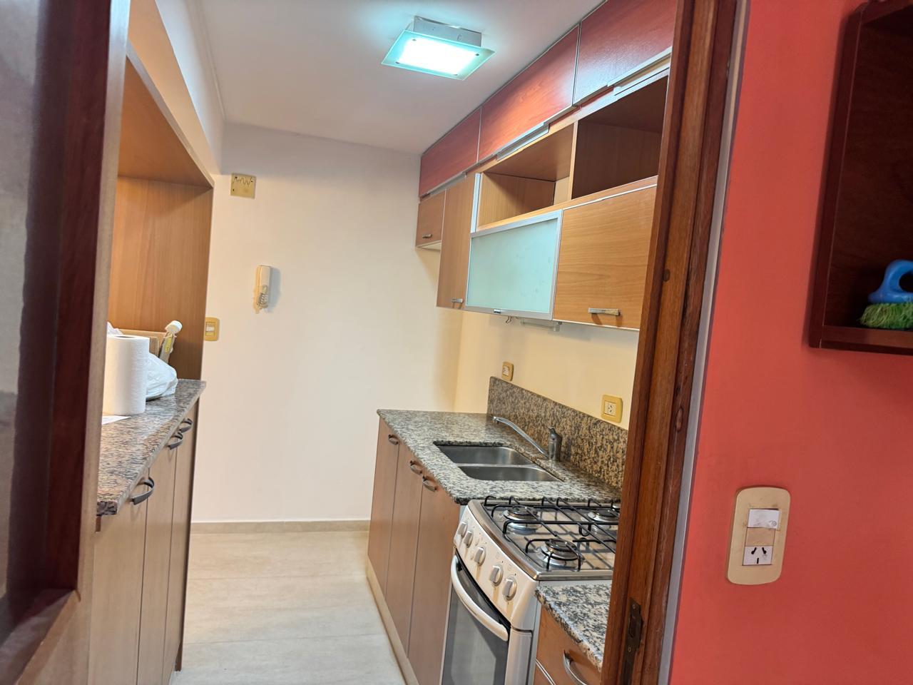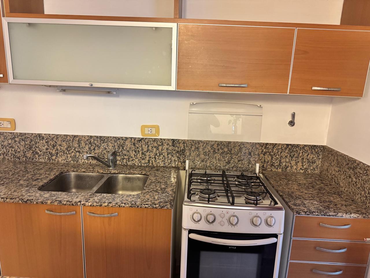 La cocina se integra de manera funcional al ambiente principal y se encuentra totalmente equipada. Se destaca por su barra desayunadora de mármol, abundante espacio de guardado (alacenas y bajo mesada) y cocina a gas de cuatro hornallas. Desde allí se accede al lavadero independiente, que cuenta con conexión para lavarropas, estanterías y termotanque para el suministro de agua caliente.