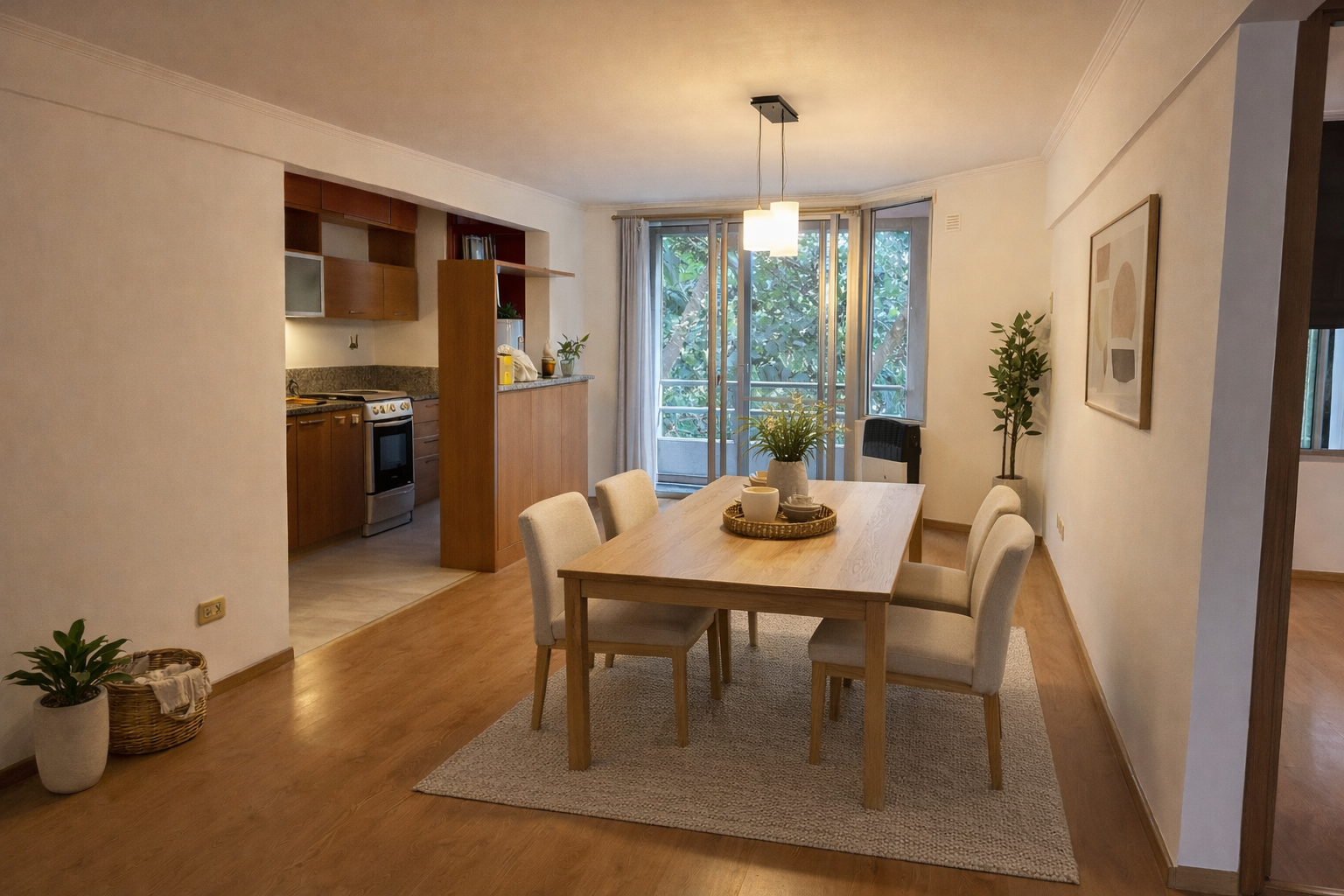 El sector íntimo se compone de dos dormitorios de buenas dimensiones, ambos con placares completos y frentes corredizos con guías de aluminio. El dormitorio principal, orientado al frente, dispone de aire acondicionado. El segundo dormitorio se ubica al contrafrente, aportando mayor tranquilidad. Completa este sector un baño completo con bañera, mampara de vidrio, vanitory con bacha, espejo, sanitarios completos y ventilación natural al exterior.
