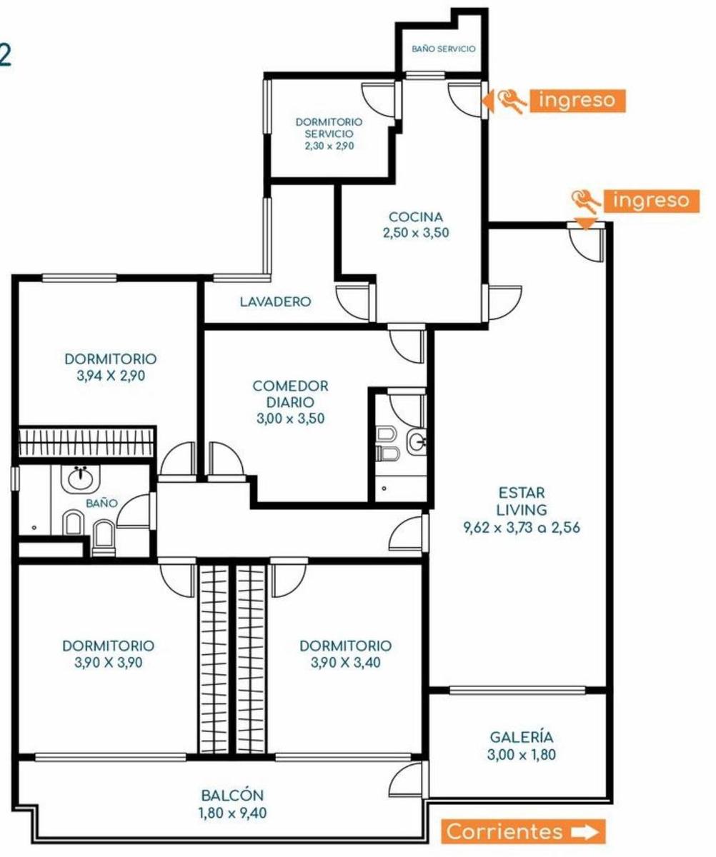 Corrientes 900: Departamento de tres dormitorios, dependencia de servicio, cochera y baulera.