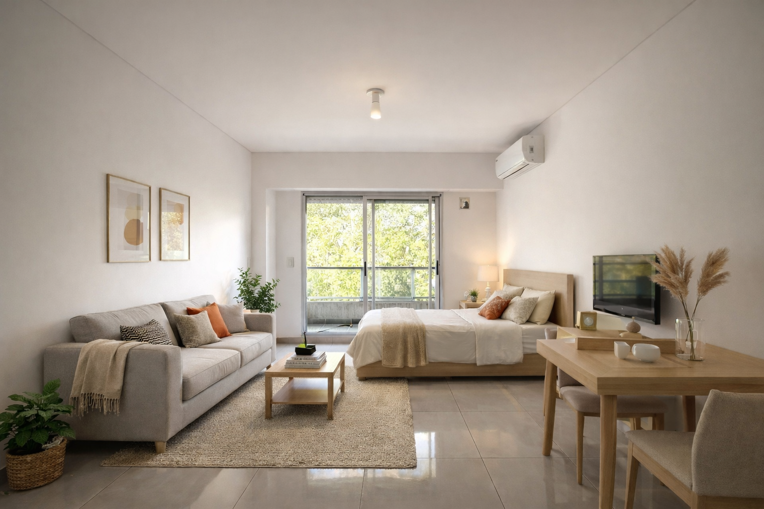 Monoambientes amplios, modernos y funcionales, diseñados para brindar confort y practicidad en el uso diario. Cada unidad cuenta con un ambiente único bien resuelto, con cocina integrada y salida a un balcón al frente que aporta excelente iluminación natural y ventilación.