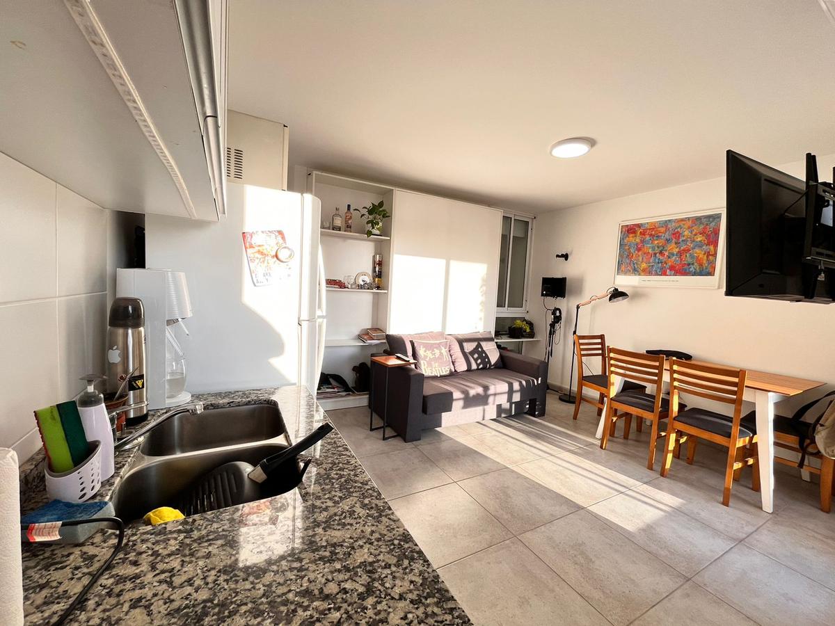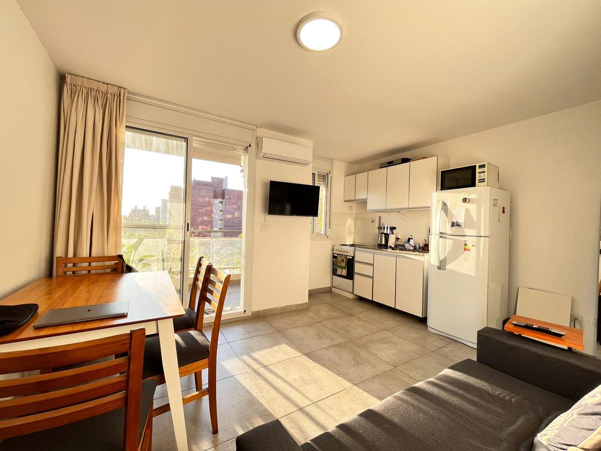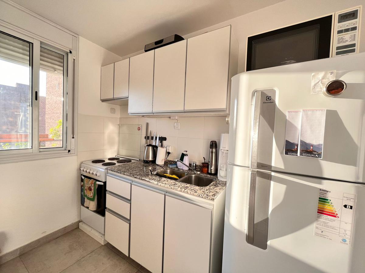 Descripción: Ingresamos al departamento de un dormitorio, ubicado en el 4to piso del edificio a un pasillo que comunica los distintos ambientes. Cuenta con un baño completo, un dormitorio de considerables medidas, y el ambiente principal con cocina eléctrica integrada y suficiente espacio como para mesa y sillón. Salida al balcón aterrazado al frente, con vista despejada.