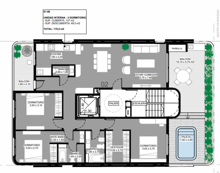 Tipología: Departamento de tres dormitorios con doble balcón con parrillero y pileta de uso exclusivo. Zona Centro