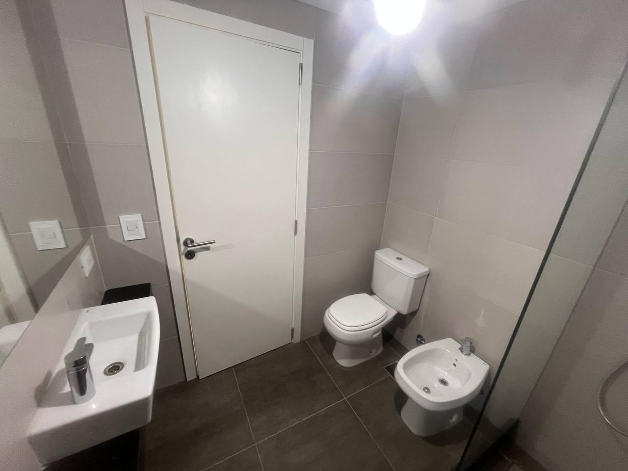 Continuando hacia el contrafrente tenemos un pasillo el cual nos dirige al baño y al dormitorio. El baño tiene inodoro, bidet, una bacha de diseño apoyada sobre el mármol que recorre todo el ancho del baño, espejo y mampara fija de vidrio templado.