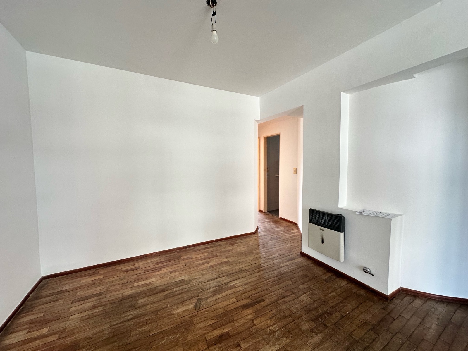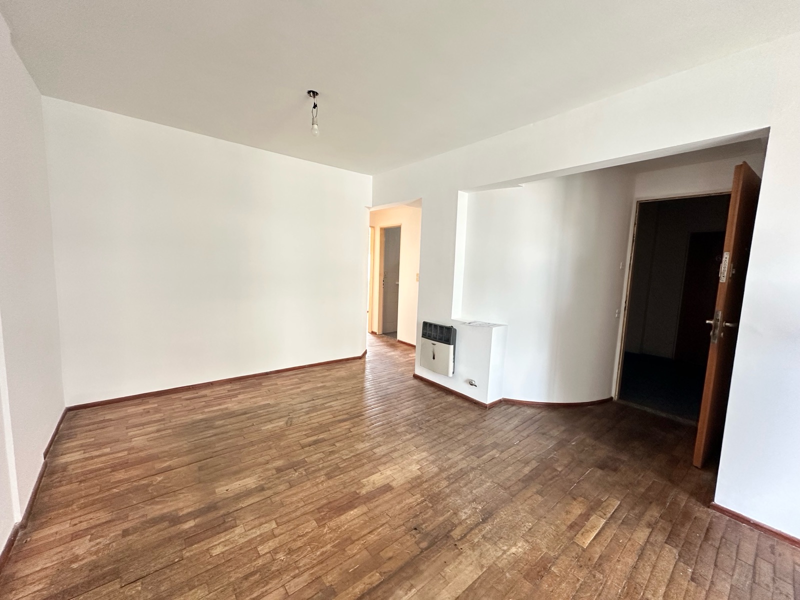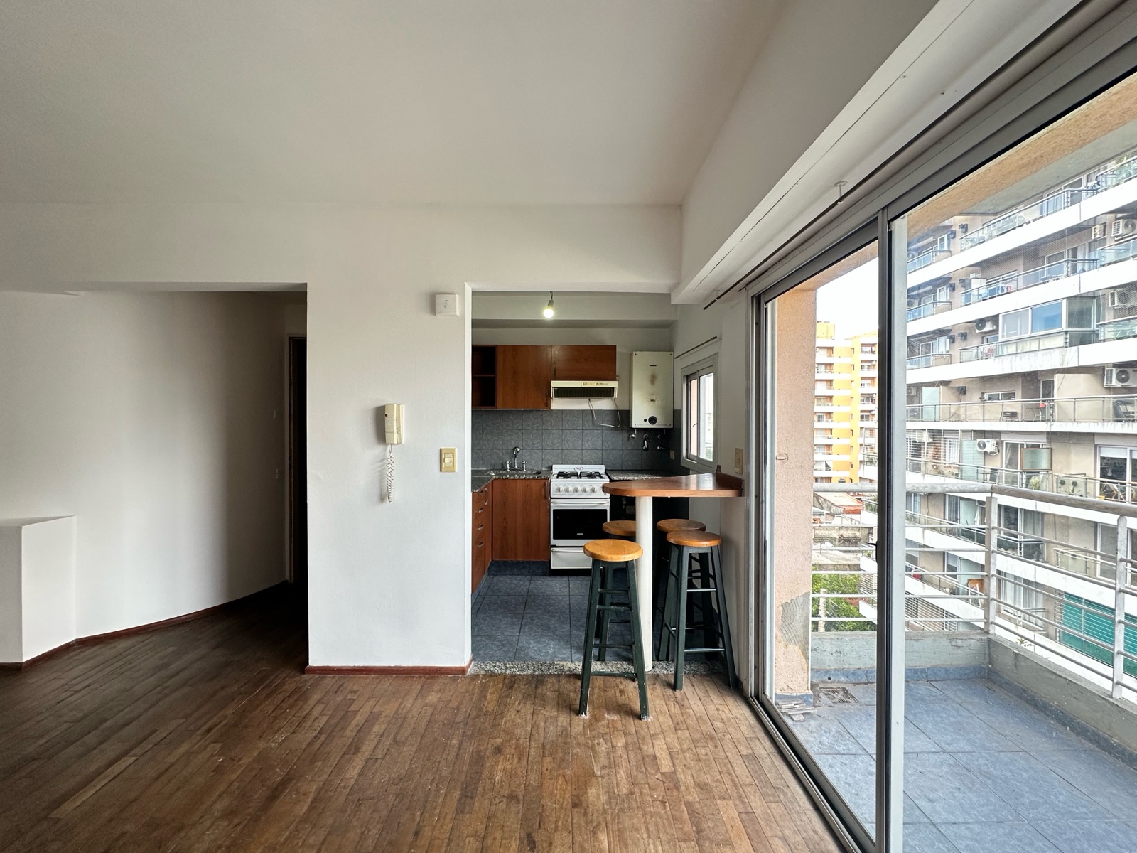 Al ingresar, nos encontramos con un amplio living-comedor con cocina integrada, generando un espacio cómodo y funcional. Los pisos de parquet aportan calidez a los ambientes. La cocina cuenta con barra desayunadora, horno a gas, extractor, calefón, espacio para lavarropas, alacenas y buena superficie de mesada.