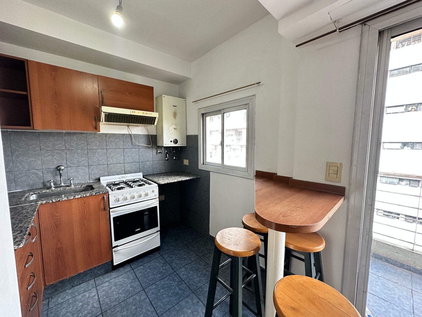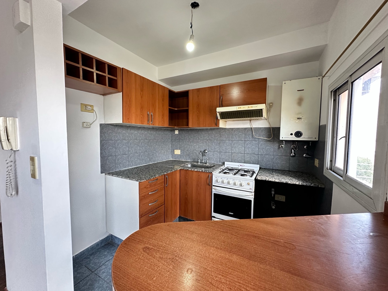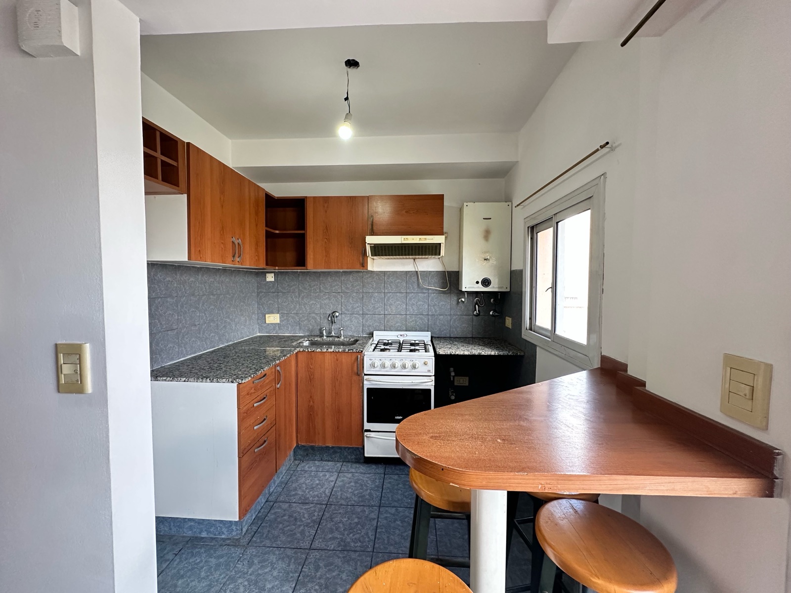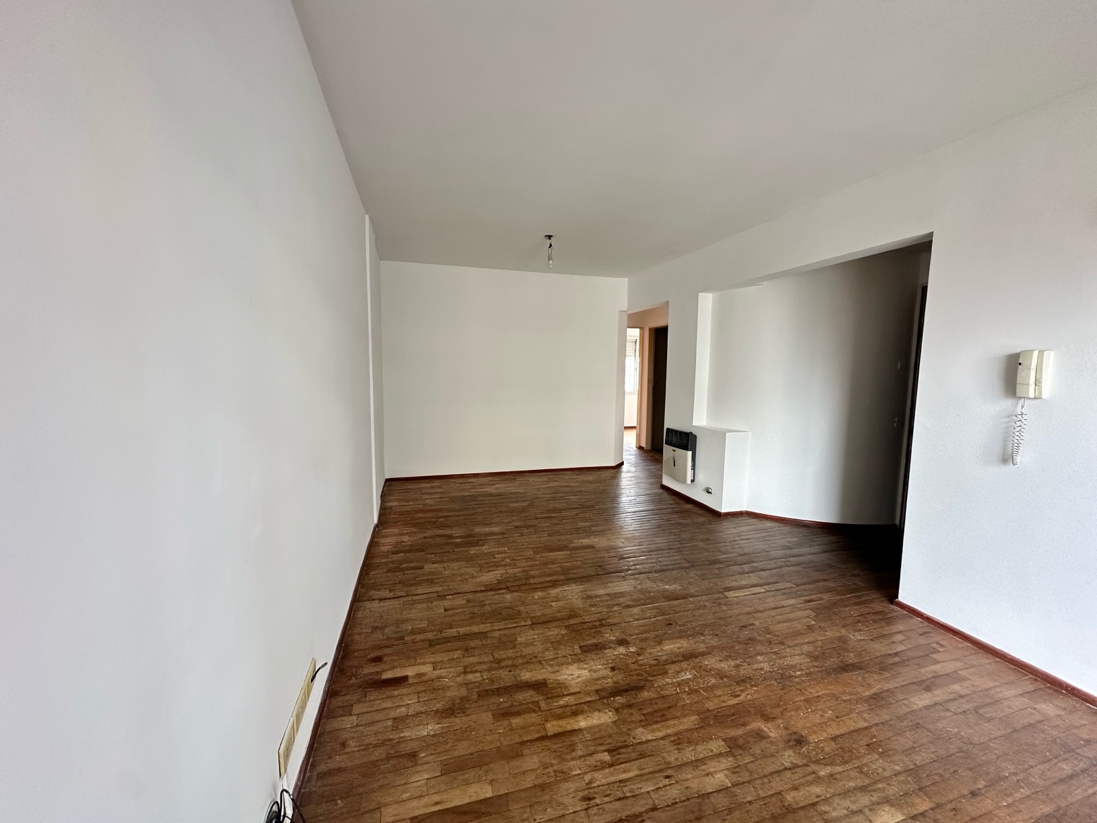 Al ingresar, nos encontramos con un amplio living-comedor con cocina integrada, generando un espacio cómodo y funcional. Los pisos de parquet aportan calidez a los ambientes. La cocina cuenta con barra desayunadora, horno a gas, extractor, calefón, espacio para lavarropas, alacenas y buena superficie de mesada.