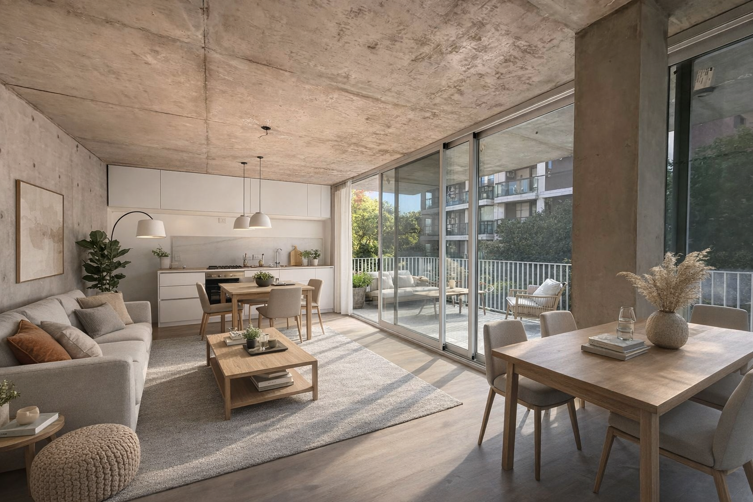 Descripción: Ingresamos por un amplio living comedor con cocina integrada que cuenta con salida a un balcón corrido al frente de amplias dimensiones.