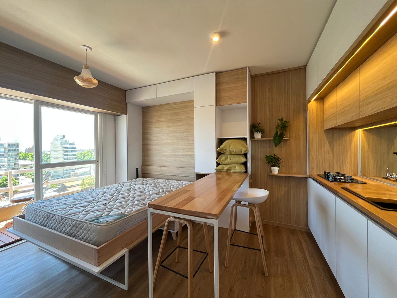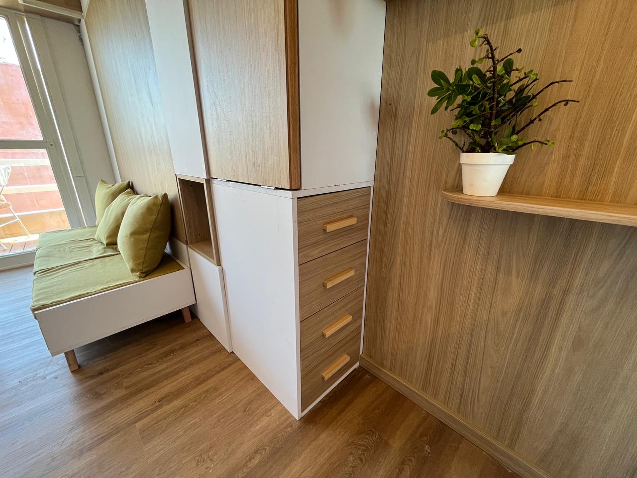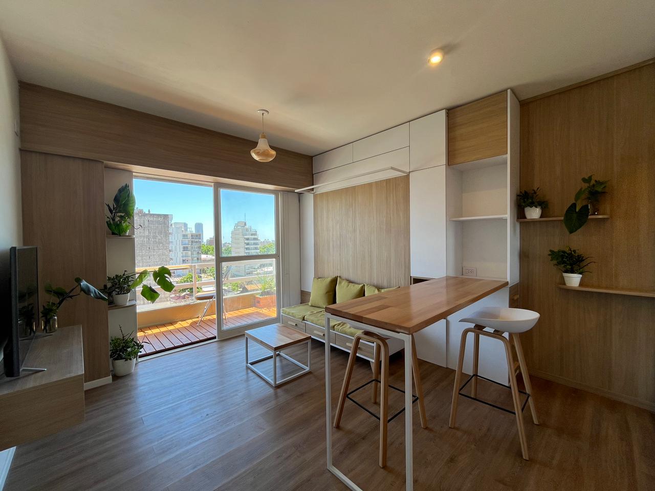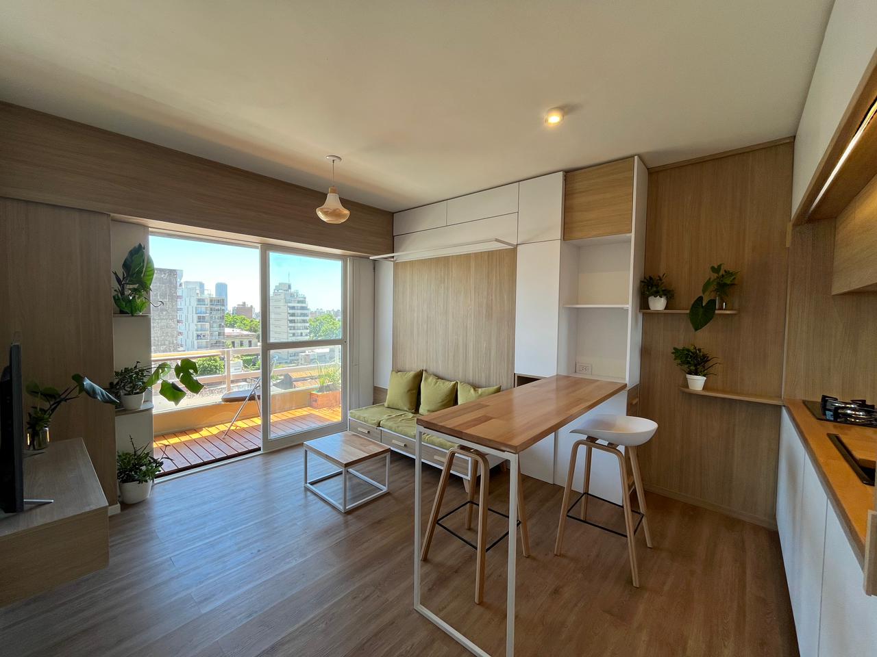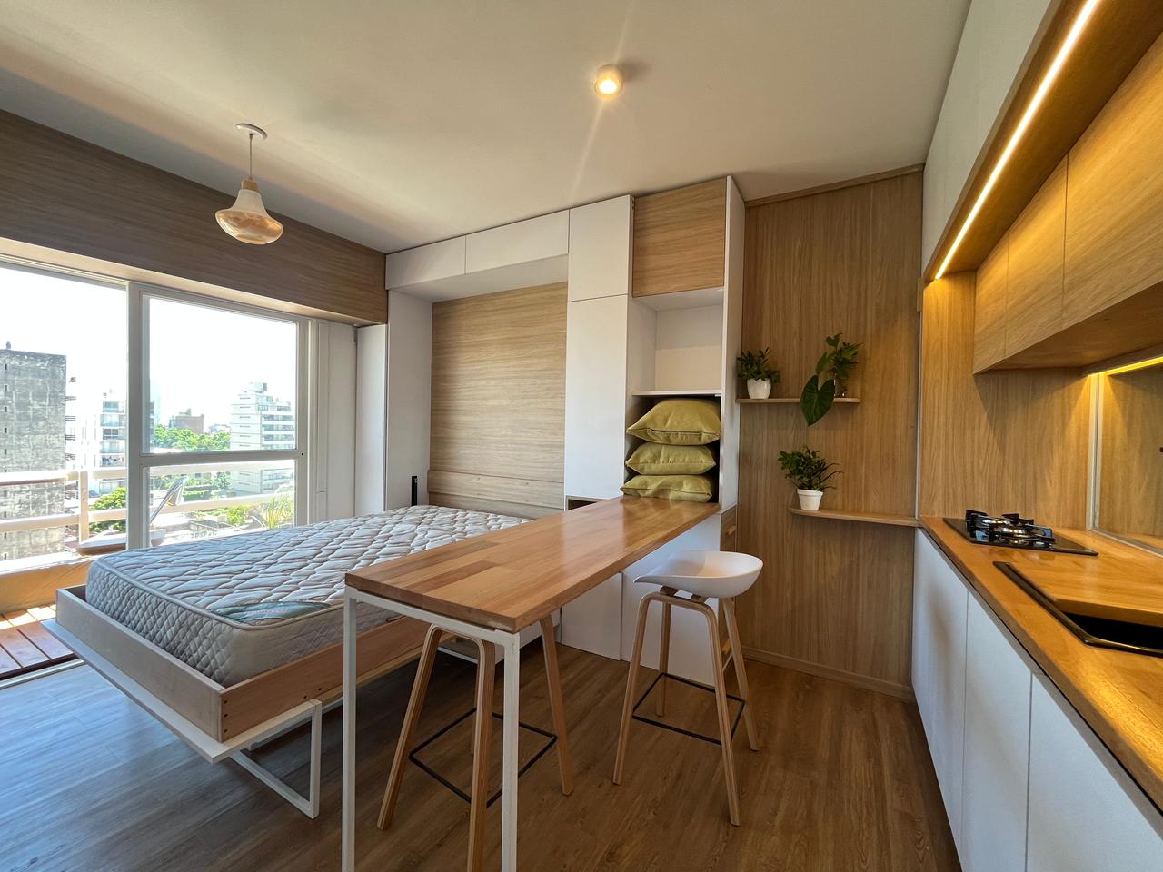Descripción: Ingresamos al departamento donde nos encontrarnos con un espacio luminoso, totalmente renovado. El departamento tiene cambiado los caños de gua fría, caliente y desagues, también la instalación eléctrica y el gas. Se ha aprovechado cada espacio para tener lugar de guardado dándole una excelente funcionalidad. Cuenta con una cocina de anafe empotrado, miroondas dentro de los muebles y heladera tipo minibar. Tanto la mesa como la cama son rebatibles para poder provechar el espacio cuando no se usan. En el balcón tiene un deck y vista al frente despejada. El baño tiene un aspecto moderno con mampara de doble acristalamiento. Porcelanatos a tono y vañitory con bacha y canilla monocomando. También cuenta con un duchdor al lado del inodoro.