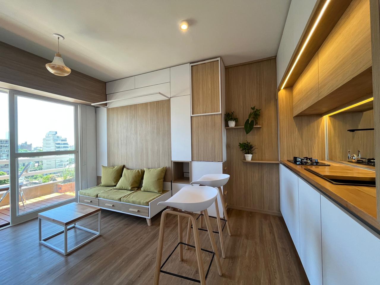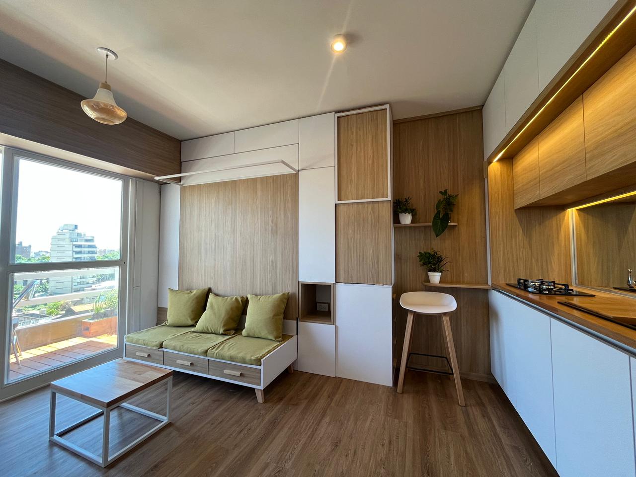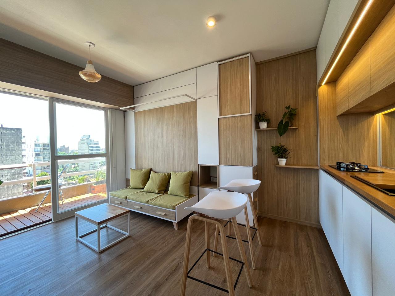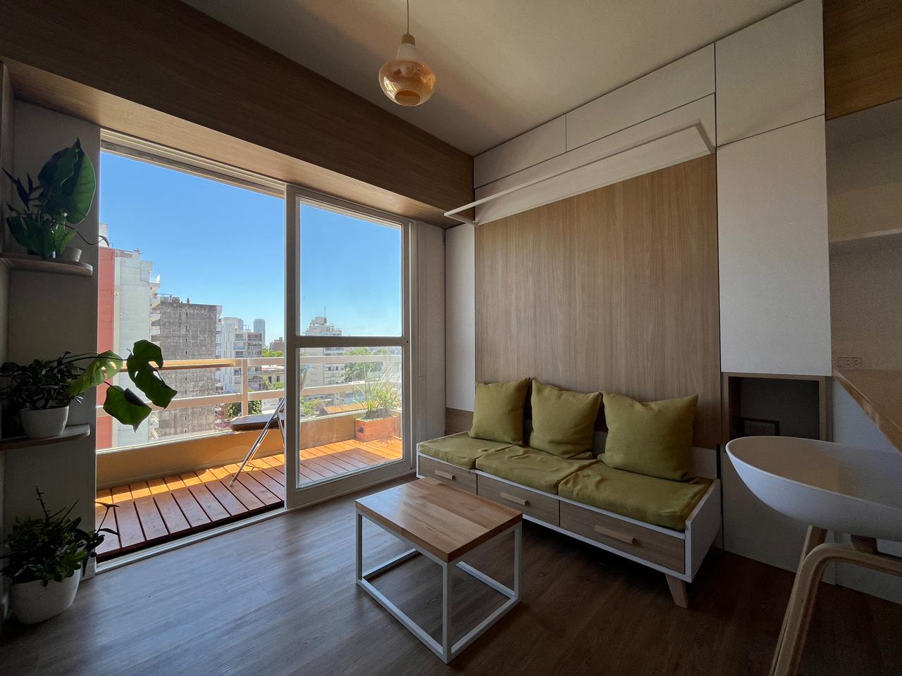 Descripción: Ingresamos al departamento donde nos encontrarnos con un espacio luminoso, totalmente renovado. El departamento tiene cambiado los caños de gua fría, caliente y desagues, también la instalación eléctrica y el gas. Se ha aprovechado cada espacio para tener lugar de guardado dándole una excelente funcionalidad. Cuenta con una cocina de anafe empotrado, miroondas dentro de los muebles y heladera tipo minibar. Tanto la mesa como la cama son rebatibles para poder provechar el espacio cuando no se usan. En el balcón tiene un deck y vista al frente despejada. El baño tiene un aspecto moderno con mampara de doble acristalamiento. Porcelanatos a tono y vañitory con bacha y canilla monocomando. También cuenta con un duchdor al lado del inodoro.