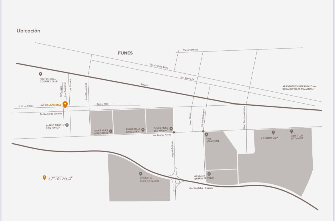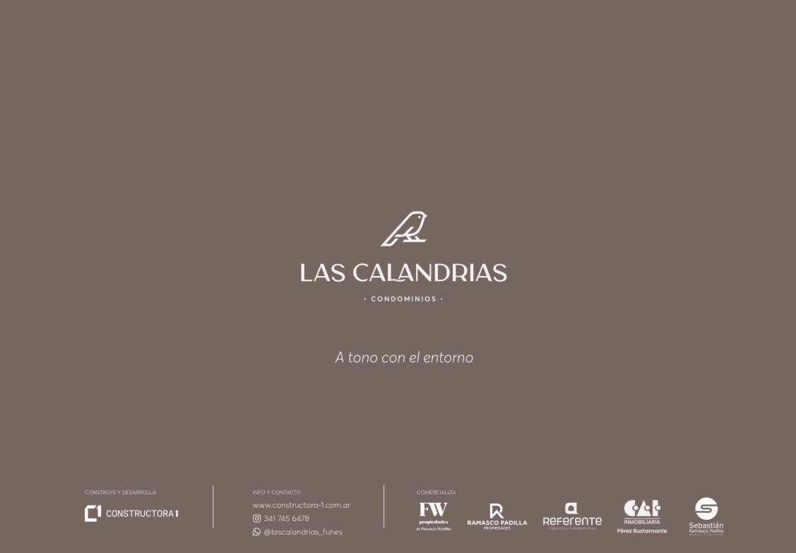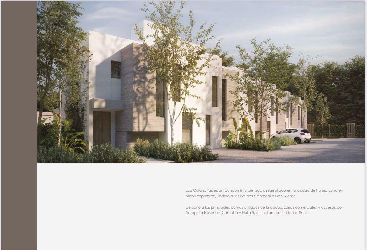 Las Calandrias: es un Condominio cerrado desarrollado en la ciudad de Funes, zona en plena expansión, lindero a los barrios Cantegril y Don Mateo. Cercano a los principales barrios privados de la ciudad, zonas comerciales y accesos por Autopista Rosario – Córdoba y Ruta 9, a la altura de la Garita 15 bis.