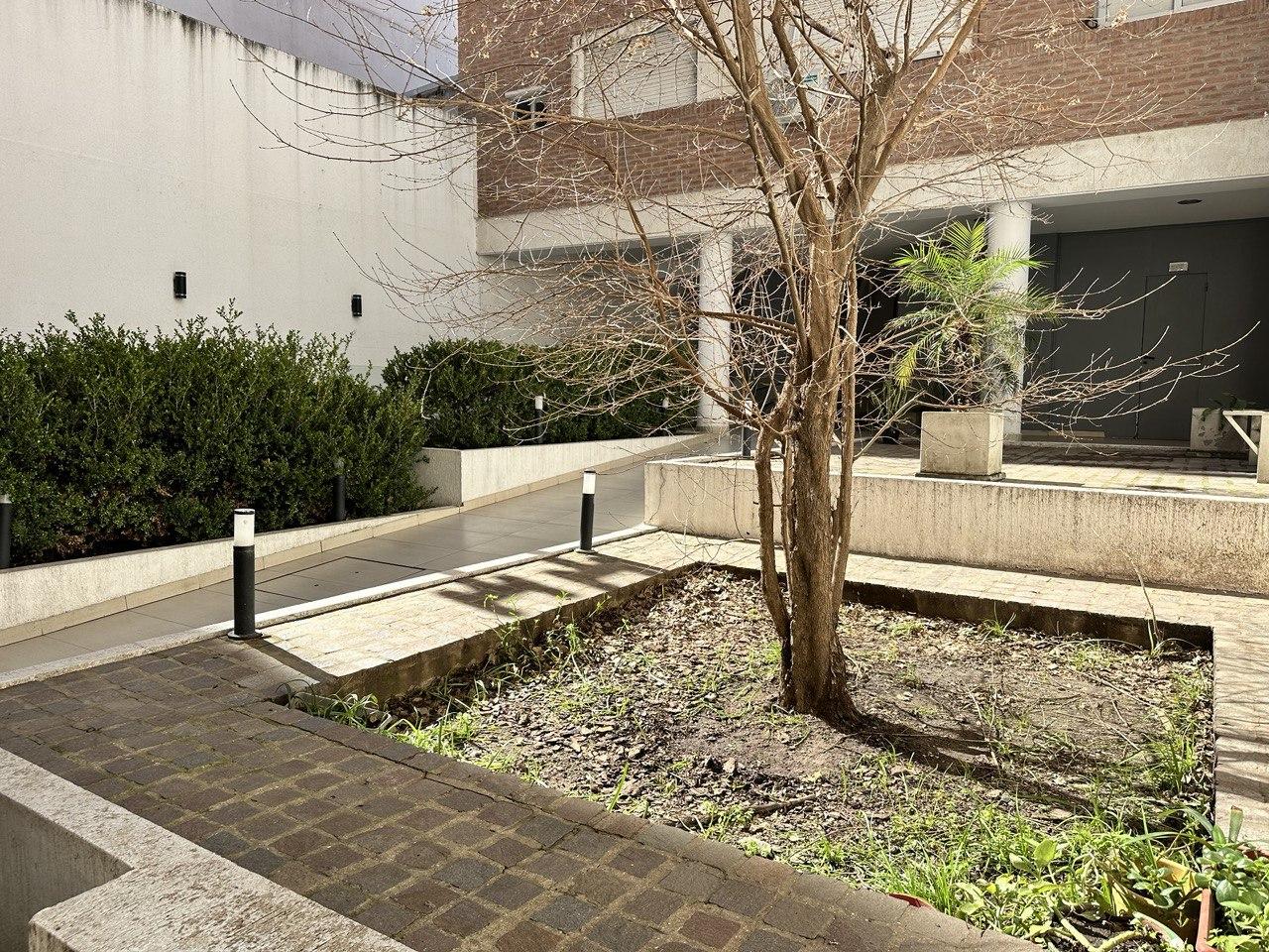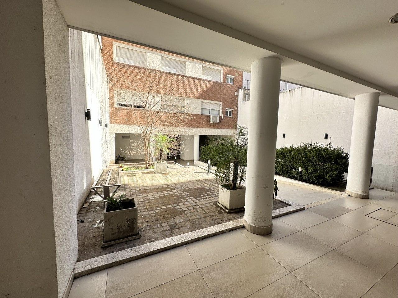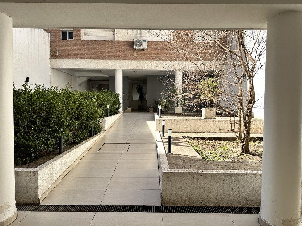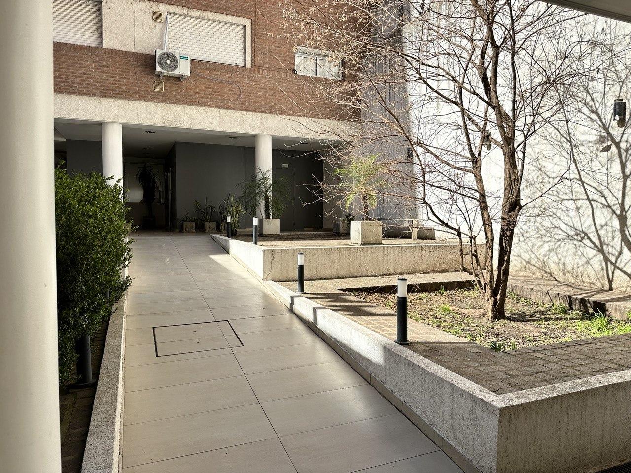 Es un edificio de dos torres, dividido por un patio central parquizado, con un ascensor por torre y cocheras cubiertas con bicicletero.