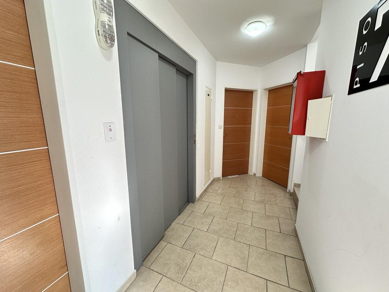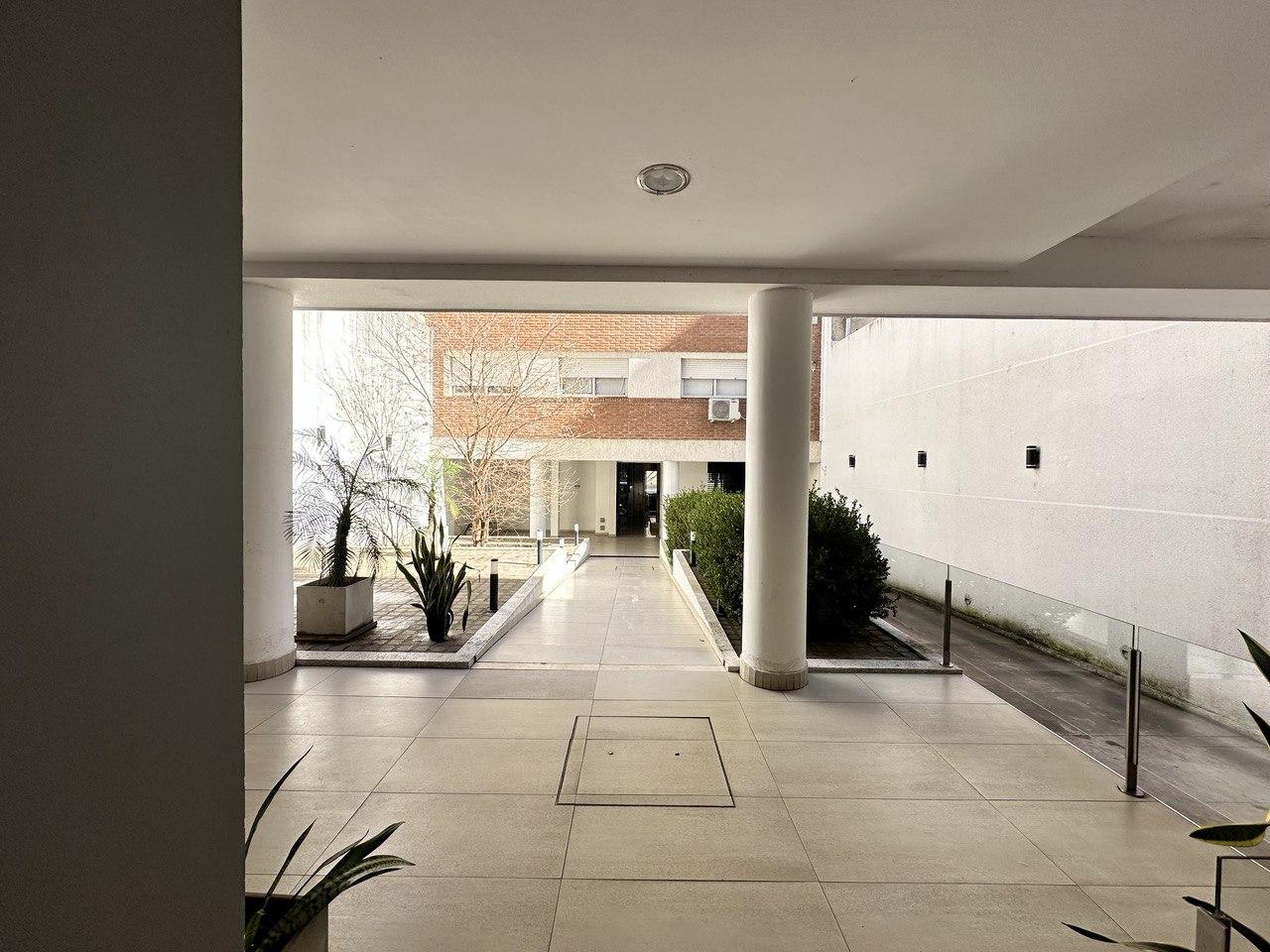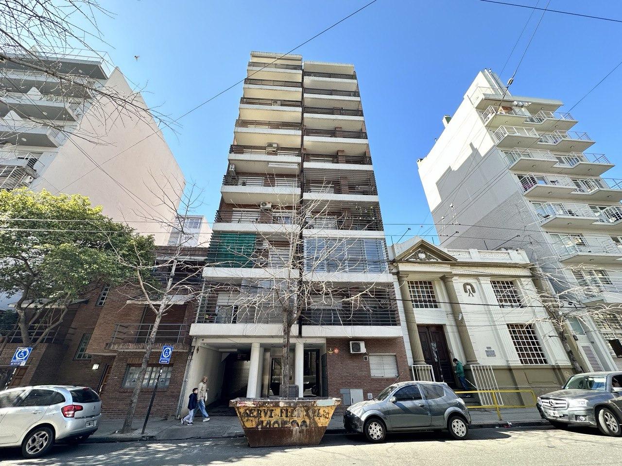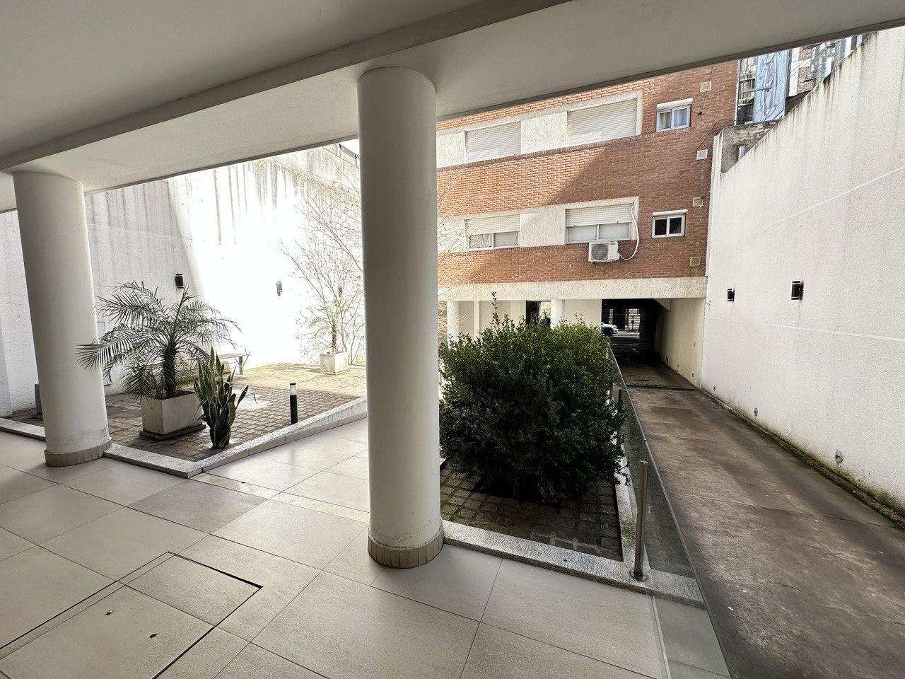 Es un edificio de dos torres, dividido por un patio central parquizado, con un ascensor por torre y cocheras cubiertas con bicicletero.