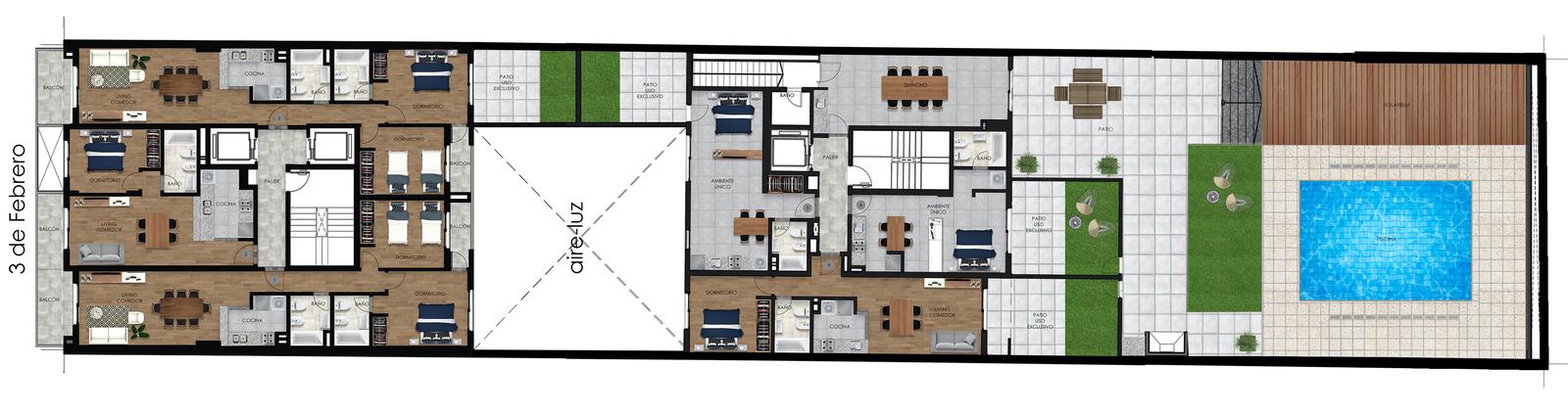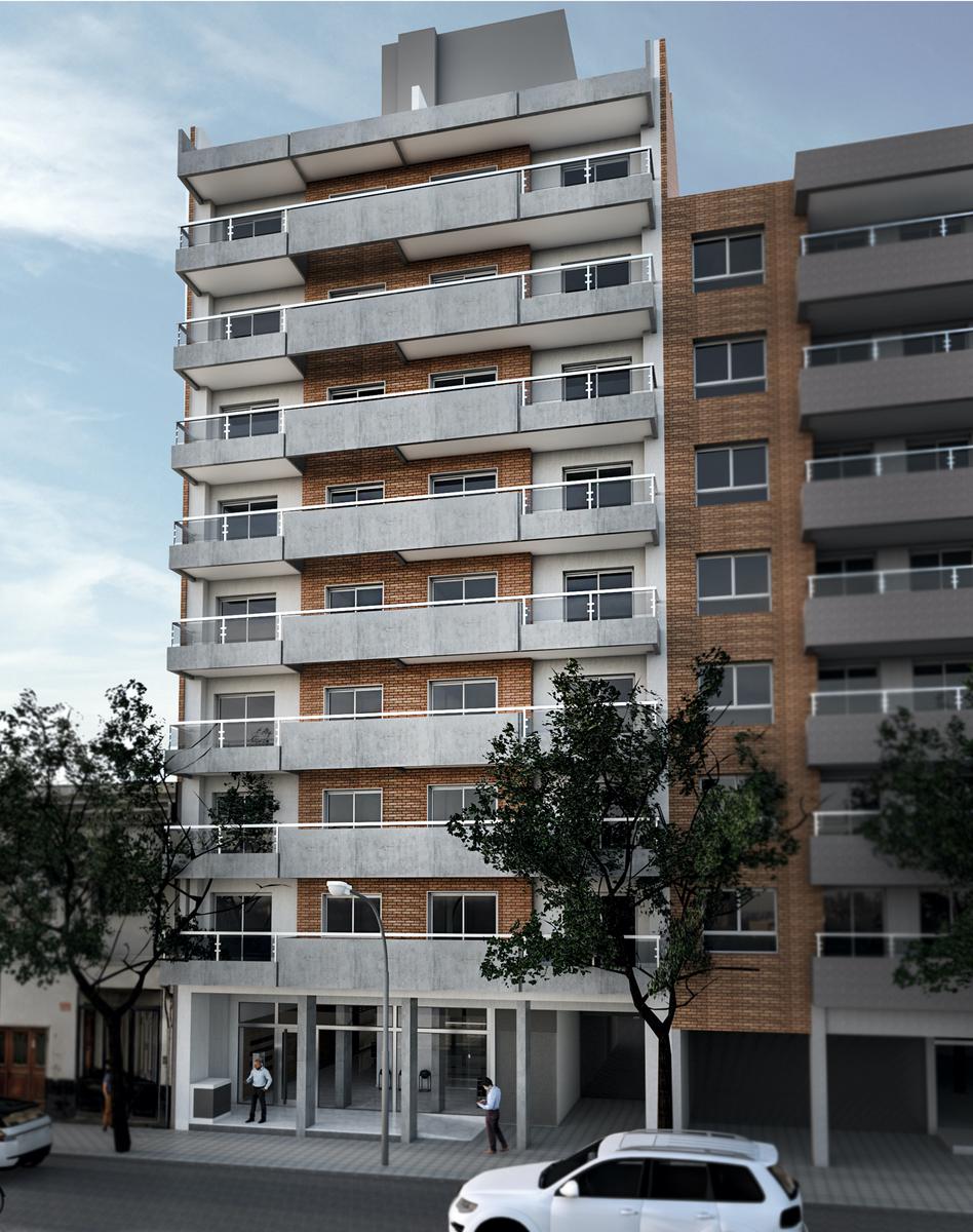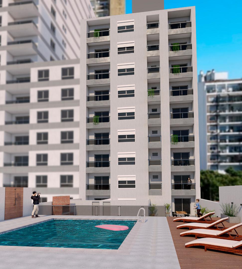 Edificio: Con dos bloques de 9 plantas que posee unidades de un dormitorio, dos dormitorios y ambientes únicos. Cuenta con 3 niveles de cocheras, SUM y áreas recreativas con parrillero, piscina y solárium